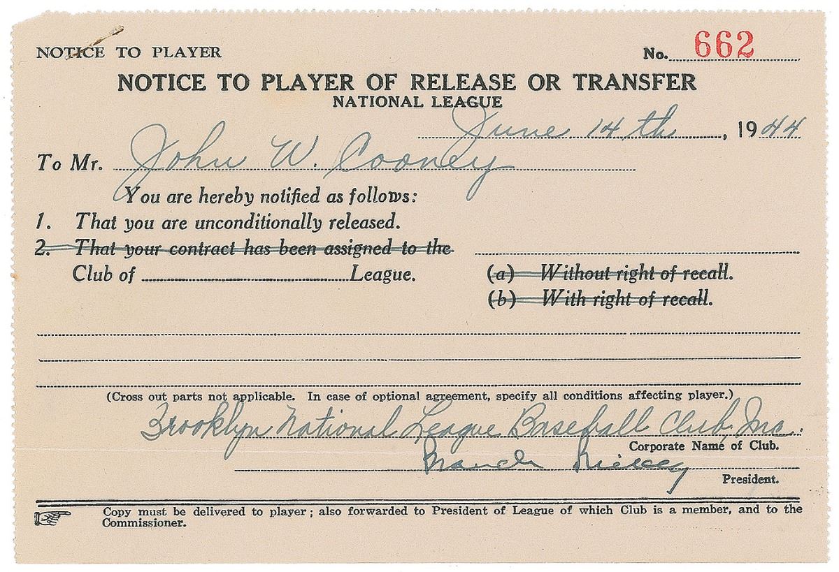 Partly-printed DS, one page, 6.25 x 4.25, June 14, 1944. A National League notice to player of release for John W. Cooney from the Brooklyn National League Baseball Club, Inc. Signed at the conclusion by Rickey as club president. In fine condition. Accompanied by the original Brooklyn Dodgers mailing envelope. Johnny Cooney enjoyed a 20-year career as a multi-positional baseball player for teams such as the Boston Braves, the Brooklyn Dodgers, and the New York Yankees. After his playing career, Cooney spent another twenty years as a manager.