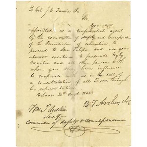 <B>Branch T. Archer Manuscript Letter Signed</B></I> A historically important LS<B> </B></I>"<I>B.T. Archer chr</B></I>" as Chairman and "<I>Wm T. Austin</B></I>" as Secretary of the Committee of Safety and Correspondence, one page, 6" x 7.75". Velasco, August 20, 1835. Committees of Safety and Correspondence, similar to those in the American Revolution, were organized in Texas as early as 1832 basically to secure the organization of the militia for defense against Indians. They kept people in touch with developments and eventually made possible an organized, effective resistance in the Texas Revolution. <B>To Col. James W. Fannin.</B></I> In full, "<I>You are appointed as a confidential agent by the committee of safety and correspondence of the Jurisdiction of Columbia to proceed to San Felipe and use your utmost exertions to persuade Wyly Martin and all other persons with whom you may have influence to co-operate with us in the call of a consultation of all Texas through her representatives.</B></I>" Five days earlier, on August 15, 1835, at a meeting in Columbia, the citizens of the town passed resolutions "that a Consultation of all Texas through her representatives is indispensable...that a committee composed of fifteen persons, to be called a Committee of Safety and Correspondence for the Jurisdiction of Columbia be elected...that they be instructed to prepare an address to all the Jurisdictions of Texas requesting them to co-operate with us in the call of a consultation of all Texas...that the Committee communicate with all Texas in the most prompt manner by sending confidential agents to each Jurisdiction...that said committee keep the people correctly advised of all political intelligence of general interest...and that they continue to act until displaced by the people or the consultation." Pursuant to the resolutions adopted by that meeting, the Committee of Safety and Correspondence met in the town of Velasco on August 18th with Archer as Chairman and Austin as Secretary, and, by this letter, appointed Col. James W. Fannin, Jr. as a confidential agent. <B>William T. Austin</B></I> later served as aide-de-camp to Stephen F. Austin and Sam Houston. At the August 18, 1835 meeting, a committee was appointed to address the "Citizens of all Texas" for the purpose of bringing about a Consultation as resolved at the Columbia meeting three days earlier. Chairman Archer was authorized to appoint delegates to the different Jurisdictions of Texas.<BR>A public meeting at San Felipe on September 12, 1835 recommended the Consultation and Wyly Martin, Randall Jones, William Pettus, Gail Borden, Jr., and Stephen F. Austin were appointed members of a committee to "order and superintend the election of delegates of this jurisdiction, and to correspond with committees of other jurisdictions." Col. Fannin was evidently successful in persuading Wyly Martin and others to cooperate with the committee and support the calling of the Consultation. EXTENSIVE RESEARCH HAS NOT UNCOVERED THE WRITING OF ANY OTHER LETTER BY ARCHER AND AUSTIN AT ANY TIME TO ANYONE ELSE WITH SIMILAR CONTENT, SO IT WAS AS A RESULT OF THIS LETTER AND FANNIN'S ENSUING EFFORT THAT THE CONSULTATION WAS HELD. <B>Wyly Martin</B></I> was acting "jefe politico" (literally, "political chief") of the Department of the Brazos and had been a delegate from San Felipe de Austin to previous conventions held in 1832 and 1833. The term "consultation" was first used at the August 15th meeting in Columbia, perhaps to avoid the revolutionary connotations that the word "convention" implied in Mexican politics. Though originally set for October 15th, the Consultation was delayed until November 1, 1835 at the insistence of delegates-elect and army officers because of possible Mexican military action after the Battle of Gonzales on October 2nd, generally considered to be the first battle of the Texas Revolution. At the Consultation which convened on November 1st, at San Felipe, <B>Branch T. Archer</B></I>, representative of Brazoria, was elected chairman. The Consultation endorsed the establishment of a provisional government, selected Archer, Stephen F. Austin, and William H. Wharton as commissioners to the United States to lobby for financial assistance, collect supplies, and recruit men for the Texas cause, and established a regular army with two-year enlistments and U.S. Army regulations. Sam Houston won unanimous election as commander with the rank of Major General. The Consultation also agreed that another popular assembly was needed to chart a course of action. On December 10, 1835, the General Council of the newly established provisional government issued a call for an election on February 1, 1836 to choose delegates to assemble at a Convention to be held on March 1, 1836. Meeting at Washington-on-the-Brazos, on March 2nd, the delegates unanimously adopted a Declaration of Independence. Ultimately fifty-eight members signed the document. Thus was born the Republic of Texas. And it all began with this letter!<BR>Continuing as an agent of the provisional government of Texas, the recipient of this letter, <B>Col. James W. Fannin</B></I>, had begun recruiting volunteers for the Matamoros expedition in January 1836. Fannin was elected colonel of the Provisional Regiment of Volunteers at Goliad on February 7th and from February 12th<I> </B></I>to March 12th, acted as commander in chief of the army. When he learned that the Mexicans had occupied Matamoros, Fannin went no further with plans for the expedition and fell back to strengthen defenses at Goliad. On March 12th, Fannin dispatched most of his force to aid Texans near Refugio. On March 14th, he received Gen. Sam Houston's order to retreat to Victoria, which rescinded a previous order to relieve the Alamo which had fallen on March 6th. Waiting for his forces under Capt. Amon B. King and Col. William Ward to return from Refugio, Fannin delayed retreating until he heard of their capture. On March 1