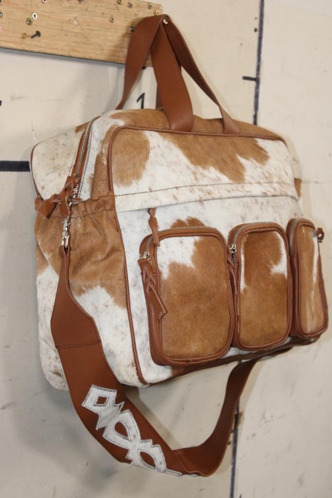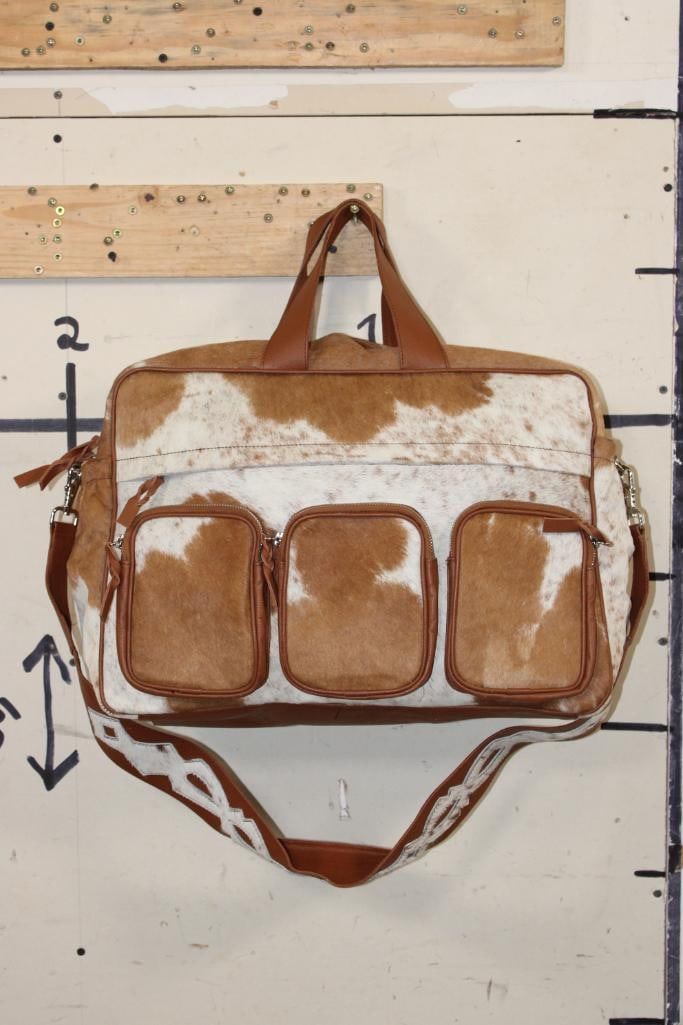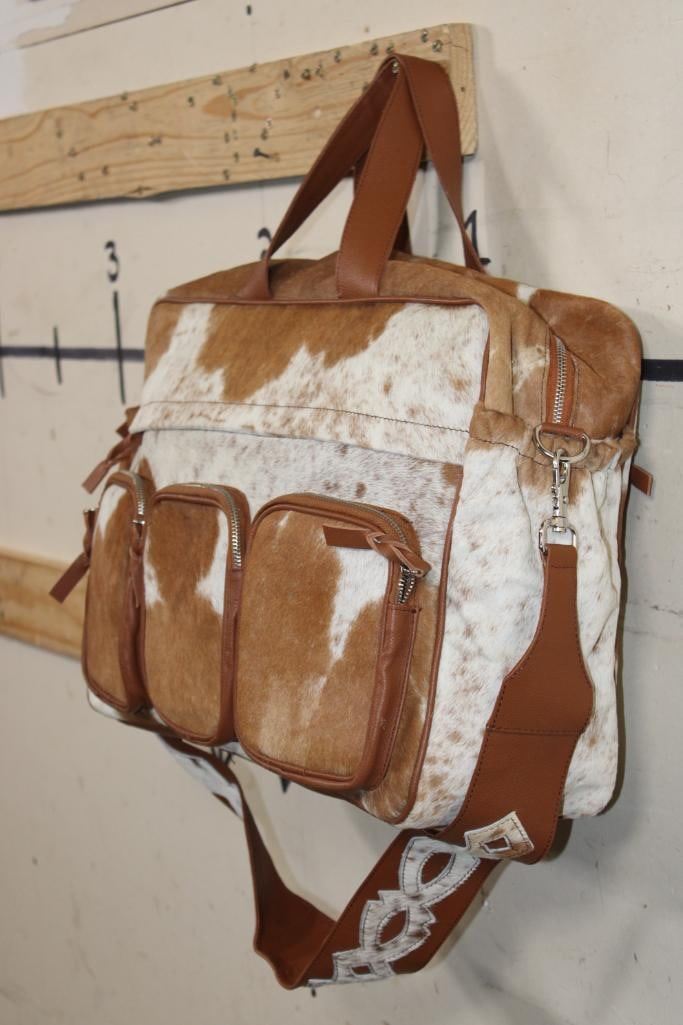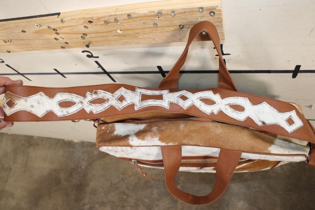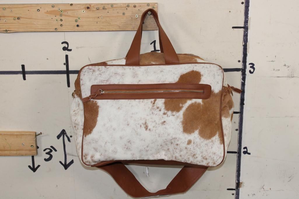 *Brand New* Cow Hide and Leather DUFFLE or TRAVEL BAG. It measures 21" Long x 10" Wide x 13" Tall. This bag has so much storage and is in a beautiful white and tan colorway. WESTERN LUGGAGE AND BAGS