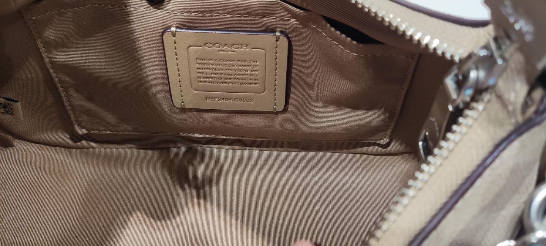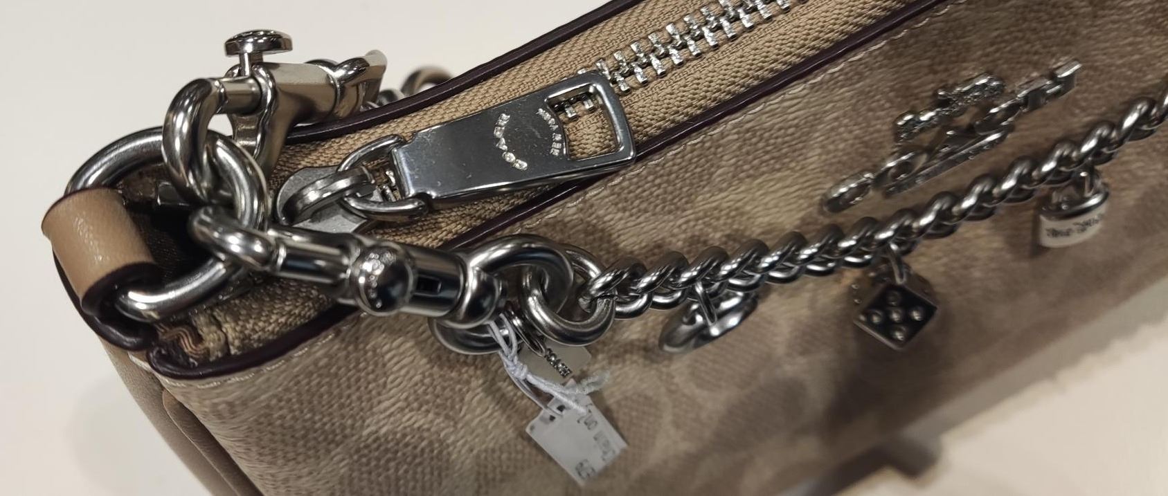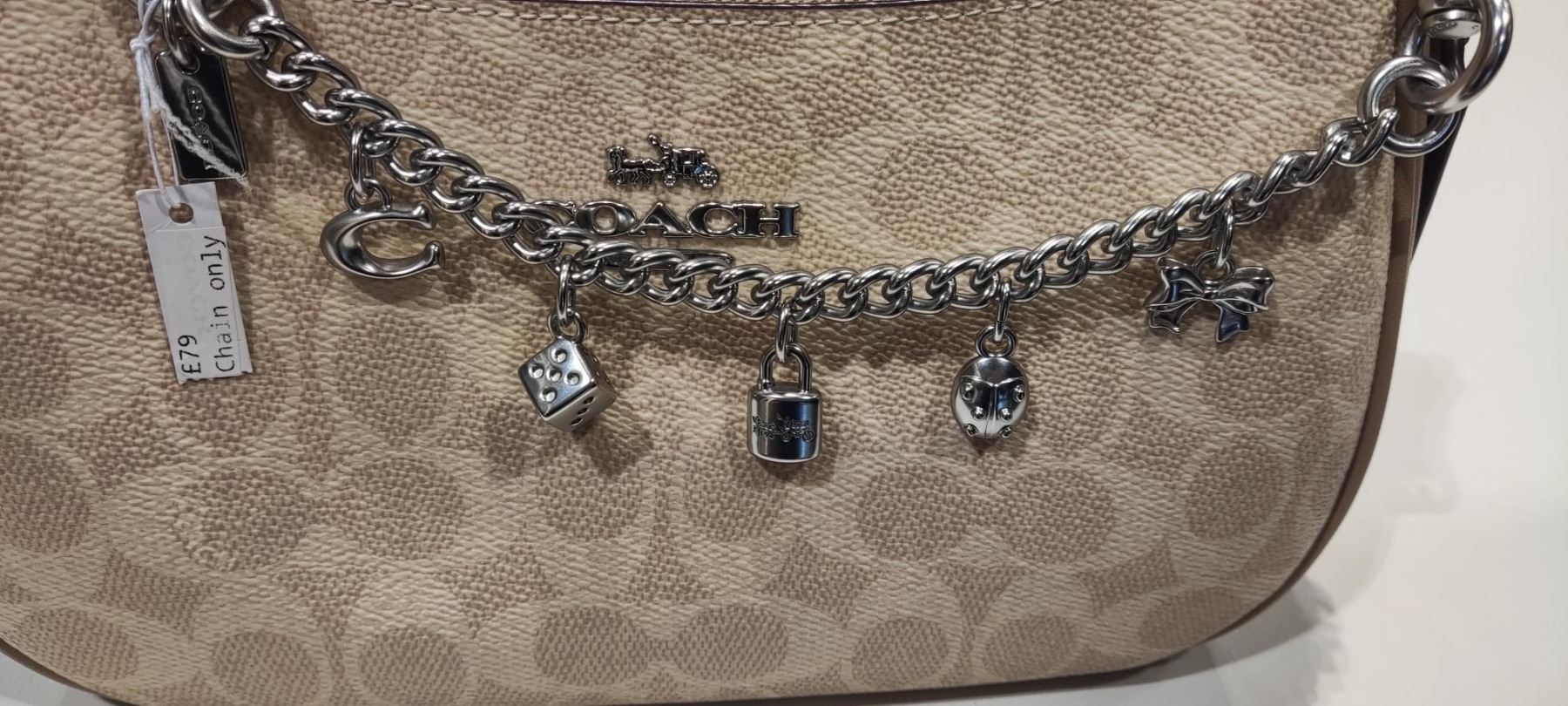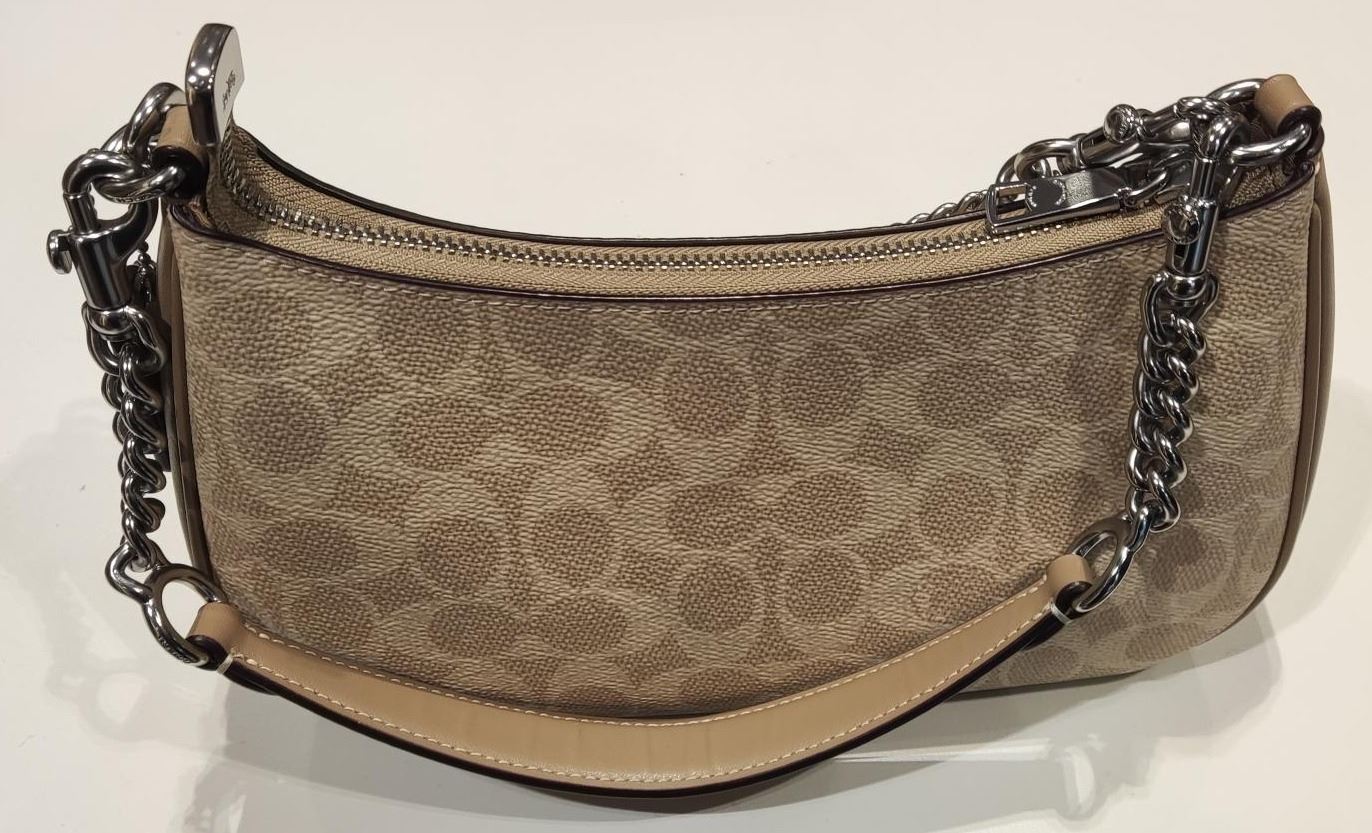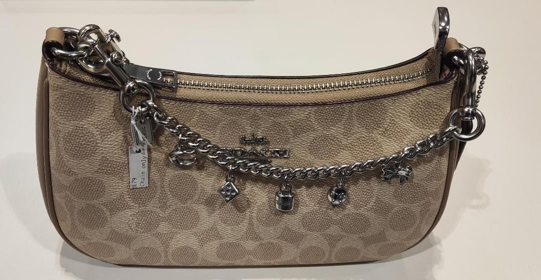 Brand new Coach Teri shoulder bag in beige with pattern print - Printed coated canvas with fabric lining, with charm metal chain.