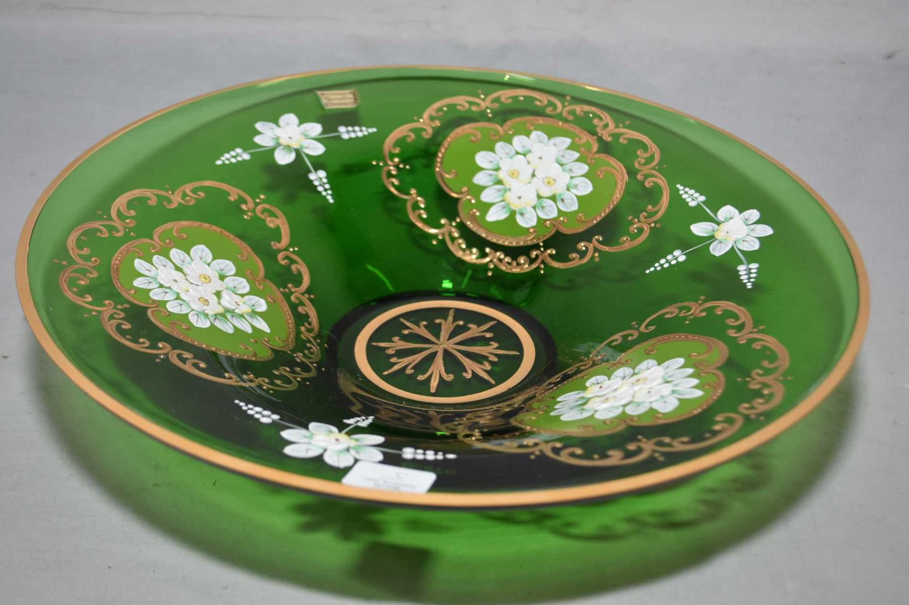 This Lot Will Not Be Shipped. Local Bidders Only. Brand new Jewellery store inventory Bohemian handcut crystal with applied 24kt gold and hand painted enamel green center bowl, 13" in diameter and retails for $750.00
