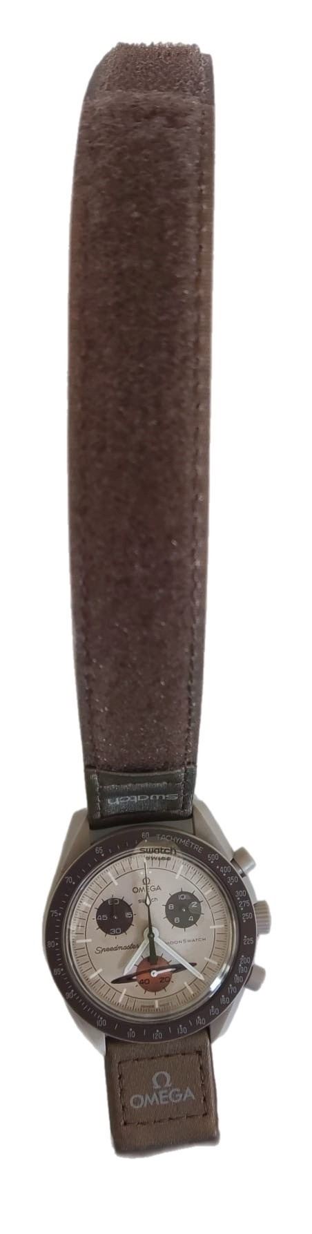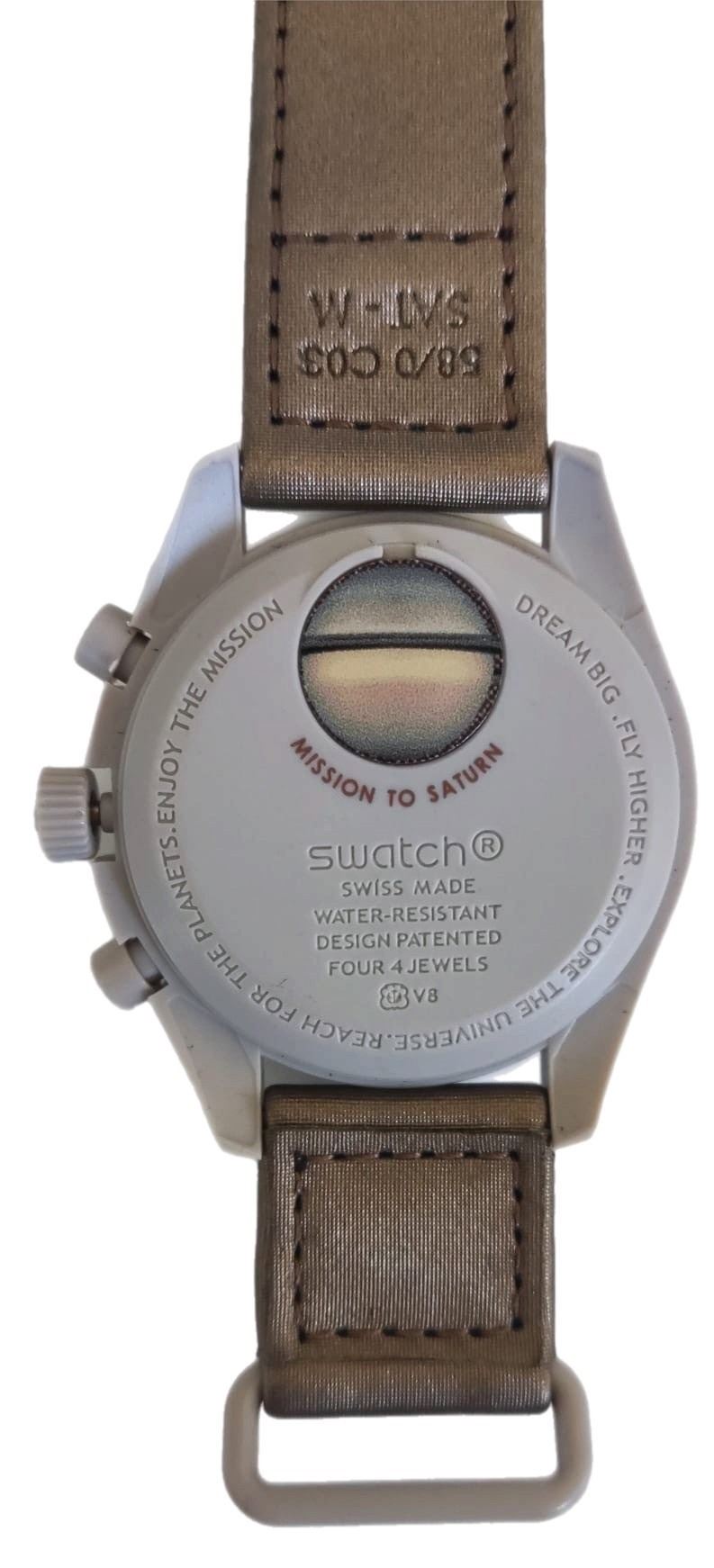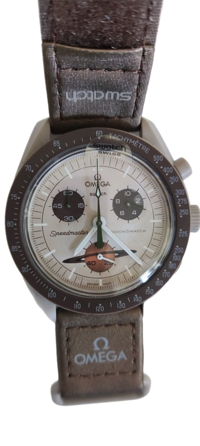 The Swatch x Omega Bioceramic Moonswatch Mission to Saturn is a highly unique and exclusive timepiece that combines the innovative design of Swatch with the iconic details of Omega. This collaboration watch features a brown dial and a velcro strap in sand and beige tones, creating a stylish and sophisticated look. What sets this watch apart from others in the collaboration is the addition of Saturn's rings on the seconds subdials, adding a celestial touch to the design. The Swatch x Omega Mission to Saturn is powered by quartz movement, ensuring accurate timekeeping. It is also water resistant up to 3 bar, making it suitable for everyday wear. The watch showcases the iconic details of the original Moonswatch from Omega, paying homage to the brand's rich heritage and craftsmanship. With its unique design and attention to detail, the Swatch x Omega Bioceramic Moonswatch Mission to Saturn is a must-have for watch enthusiasts and collectors alike. Whether you're looking to make a bold statement or add a touch of elegance to your wrist, this timepiece is sure to impress.