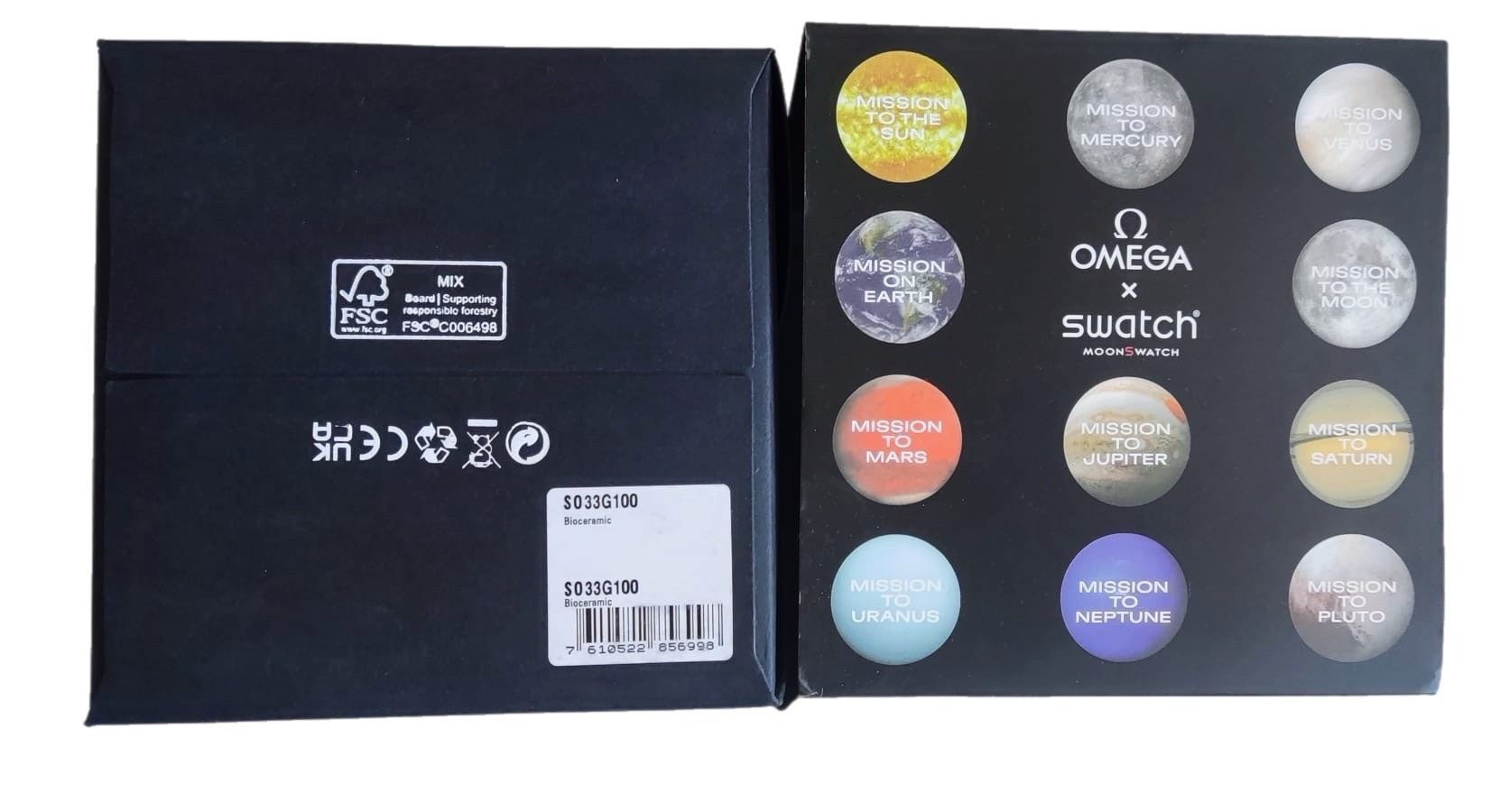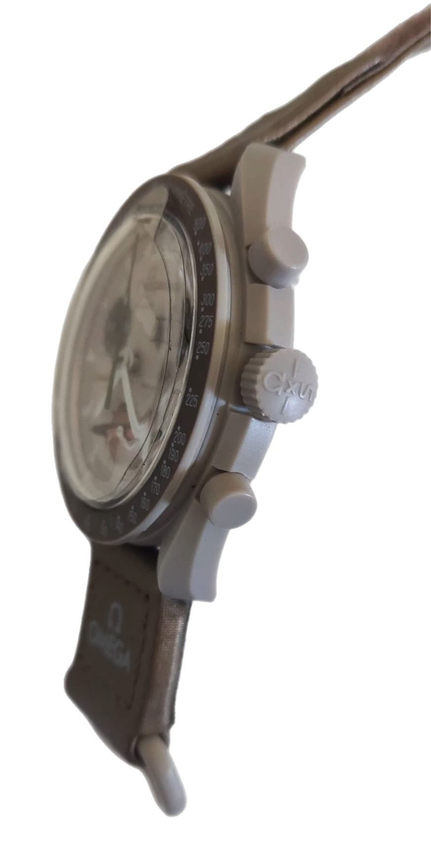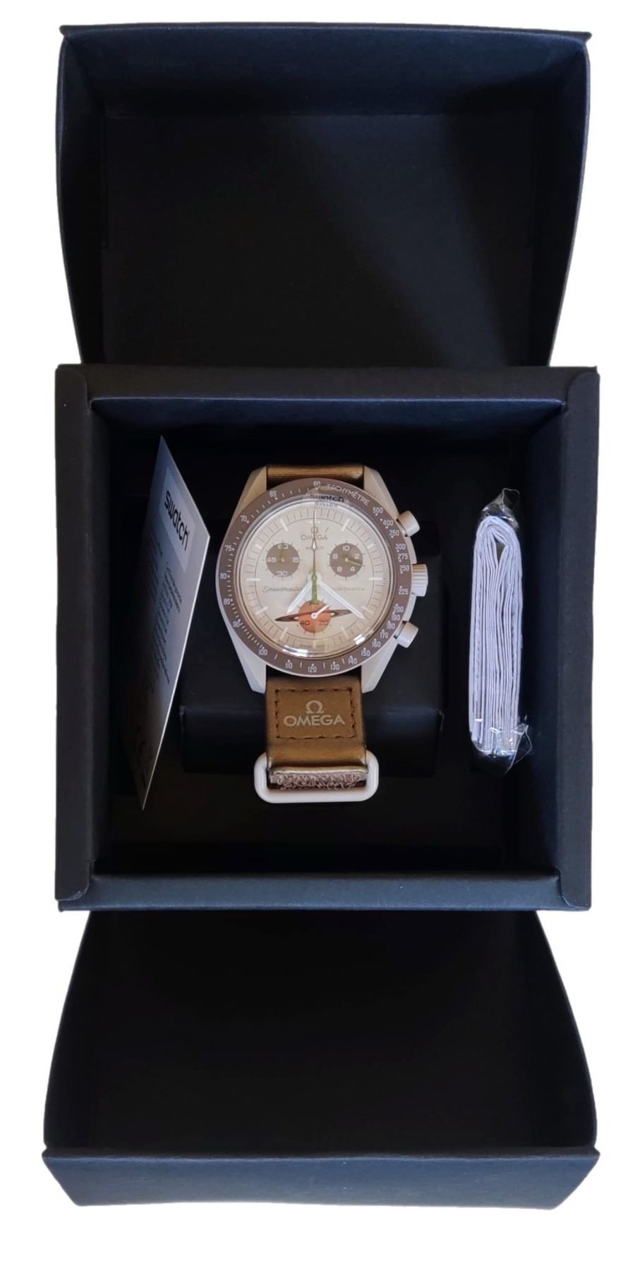 The Swatch x Omega Bioceramic Moonswatch Mission to Saturn is a highly unique and exclusive timepiece that combines the innovative design of Swatch with the iconic details of Omega. This collaboration watch features a brown dial and a velcro strap in sand and beige tones, creating a stylish and sophisticated look. What sets this watch apart from others in the collaboration is the addition of Saturn's rings on the seconds subdials, adding a celestial touch to the design. The Swatch x Omega Mission to Saturn is powered by quartz movement, ensuring accurate timekeeping. It is also water resistant up to 3 bar, making it suitable for everyday wear. The watch showcases the iconic details of the original Moonswatch from Omega, paying homage to the brand's rich heritage and craftsmanship. With its unique design and attention to detail, the Swatch x Omega Bioceramic Moonswatch Mission to Saturn is a must-have for watch enthusiasts and collectors alike. Whether you're looking to make a bold statement or add a touch of elegance to your wrist, this timepiece is sure to impress.