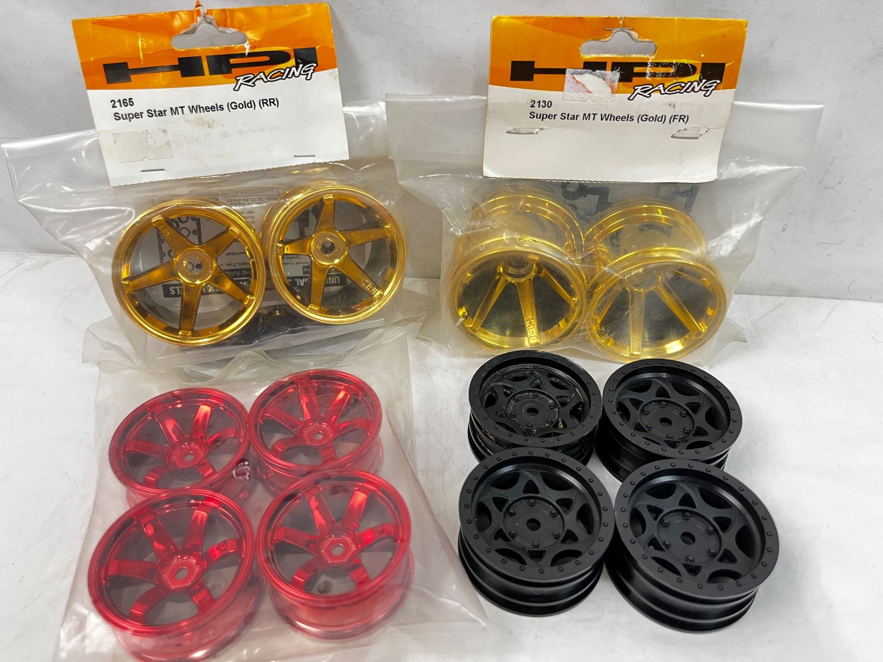 Includes 1 pack of 4 red and silver 6mm - 1 pack of 4 black 2" - 2 packs of 2 gold super star MT
