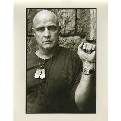 <B>Photo of Marlon Brando as Colonel Kurtz by Mary Ellen Mark.</B></I> An 11" x 14" b&w silver gelatin print of Marlon Brando as Colonel Kurtz, from a portrait taken by accomplished photographer Mary Ellen Mark on the set of <I>Apocalypse Now,</B></I> one of the many productions on which Mark worked as a still photographer during the '60s and '70s. In Excellent condition with Mark's studio stamp on the reverse side. <I>From the collection of Marlon Brando.</B></I>