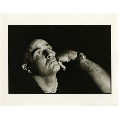 <B>Marlon Brando in Shadows Photo by Mary Ellen Mark.</B></I> A 14" x 11" b&w silver gelatin print of a brooding Marlon Brando, taken by photographer Mary Ellen Mark on the set of <I>Apocalypse Now.</B></I> Brando showed up on the set not only having not learned his lines, but also massively overweight when his character had been been scripted as tall and emaciated. Both Mark and director Francis Ford Coppola photographed him in basically the same way: shrouded in shadows and with careful angles that hid his belly and made the 5'10" actor appear to be a 6'5" brute. In Excellent condition with Mark's studio stamp on the reverse side. <I>From the collection of Marlon Brando.</B></I>