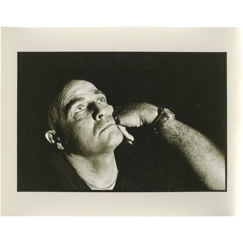 <B>Marlon Brando in Shadows Photo by Mary Ellen Mark.</B></I> A 14" x 11" b&w silver gelatin print of a brooding Marlon Brando, taken by photographer Mary Ellen Mark on the set of <I>Apocalypse Now.</B></I> Brando showed up on the set not only without having learned his lines, but also massively overweight, when his character had been been scripted as tall and emaciated. Both Mark and director Francis Ford Coppola photographed him in basically the same way: in shadows and with careful angles that hid his belly and made the 5'10" actor appear to be a 6'5" brute. In Excellent condition with Mark's studio stamp on the reverse side. <I>From the collection of Marlon Brando.</B></I>
