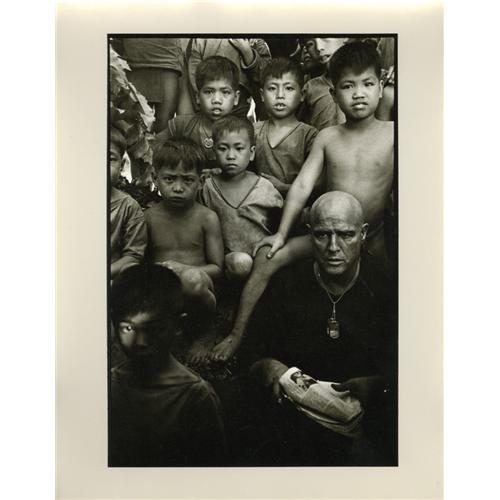 <B>Marlon Brando in Shadows Photo by Mary Ellen Mark.</B></I> A wonderful 11" x 14" b&w silver gelatin print of Marlon Brando with several Filipino children, taken by photographer Mary Ellen Mark on the set of <I>Apocalypse Now</B></I> during the filming of one of Brando's key scenes opposite Martin Sheen. (Note the "War" medallion worn by one of the children in the background.) In Excellent condition with Mark's studio stamp on the reverse side. <I>From the collection of Marlon Brando.</B></I>