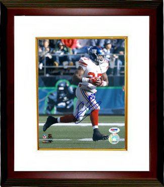 Brandon Jacobs is a star on the rise. A fourth-round pick in the 2005 NFL draft after stints at Coffeyville, Auburn and Southern Illinois, the talented running quickly made his presence felt on the New York Giants and against their opponents. He led all rookies with seven rushing touchdowns in 2005, rushed for nine TDs as a goal-line specialist in 2006, and in 2007, after becoming Big Blue's primary running back, rushed for 1,009 yards and four TDs, and caught two passes for TDs as well. Brandon Jacobs has hand signed this New York Giants 8x10 Photo. PSA Hologram and Certificate of Authenticity. Custom White Mat and Premium Mahogany Frame as shown