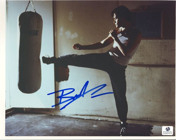 The son of the famed martial artist Bruce Lee, Brandon Lee has signed this kick-boxing posed photo from the film "Rapid Fire" in blue ink. Brandon suffered an unfortunate accident and was killed on the set of "The Crow". This item has been certified by Global Authentics and was issued number GV681615.