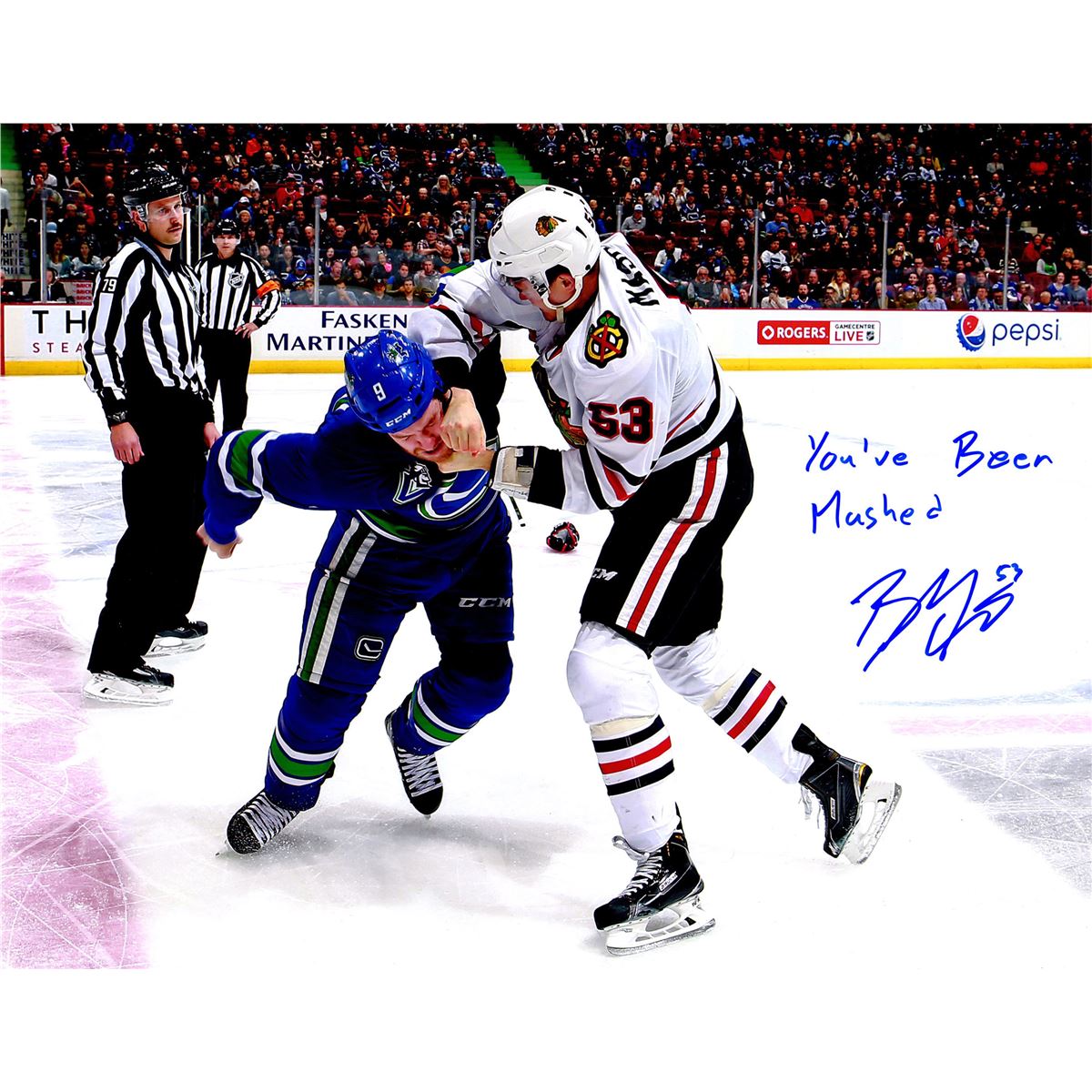 Brandon Mashinter signed Chicago Blackhawks fighting forearm punch 11x14 photo with 'You've Been Mashed' inscription. Item comes with a Schwartz Sports Memorabilia tamper-proof numbered hologram and Certificate of Authenticity which can be verified onlin