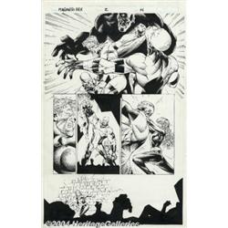 Brandon Peterson and Matt Banning - Original Art for Magneto Rex #2, pages 14, 18, and 21 (Marvel, 1999). Rogue, Quicksilver, and more are featured on these three exceptionally detailed pages from this exciting limited series. These feature Peterson at his best, and all practically throb with action. The pages measure 11" x 17" and are in excellent condition overall. Important notice: Heritage usually auctions material at the rate of 200-250 lots per hour. On some occasions eBay Live bid software or the Internet may not be able to keep up with the pace of the auction. We recommend placing a realistic absentee bid now as insurance to avoid disappointment. Occasionally the auctioneer may eliminate or reject an eBay Live bid, and the auctioneer may also reopen a lot after the close of the eBay live bidding (usually because we missed an audience bid), and may reject your bid even if it shows you as the winning bidder. By bidding via eBay Live, you agree that Heritage may award the lot to another bidder at its sole discretion under the circumstances described above or any other reasonable circumstances. Since eBay bids are not shown to us until we open the lot on the floor, we treat those bids just like floor bids. In most cases the floor responds before the eBay bid is presented to us, due to Internet lag time, so for consistency we have made it a policy that floor bids are always considered first over tie eBay live bids. Also please note that all Heritage lots purchased through eBay Live carry a 20% Buyer's Premium. Please make sure you read the Terms and Conditions before you bid.