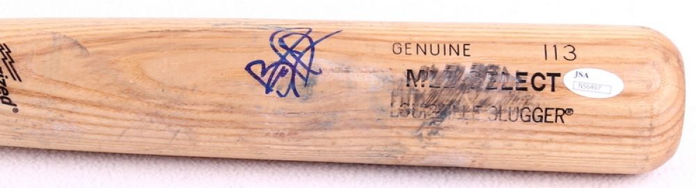 Louisville Slugger Baseball Bat. Hand-signed in blue felt-tip pen by Brandon Phillips (Reds). The bat has been game-used and cracked by an unknown player. The autograph includes an official James Spence Authentication (JSA) hologram and matching COA for authenticity purposes.