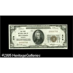 <B>Brandon, VT</B></I> - $20 1929 Ty. 1 <B>The First NB </B></I> Ch. # 278<BR>This bank gained its charter during the Civil War and survived to issue through the end of the National Bank Note era. This example is a pack fresh <B>Choice Crisp Uncirculated</B></I> we'd have classified as a Gem but for centering issues. Lot:17009