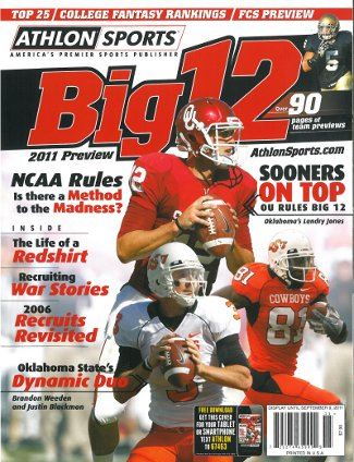 The Athlon Sports 2011 Big 12 College Football Annual presents all the great preseason analysis and predictions you've come to expect from Athlon Sports. Look for regional features on Texas' new deal with ESPN, Oklahoma State's dynamic duo of Brandon Weeden and Justin Blackmon, Texas A&M's ability to handle the hype heading into this season and Baylor's one-man show, quarterback Robert Griffin. This year's edition also includes war stories from life on the hyper-competitive recruiting trail, an examination of whether or not there is a method to the madness of the NCAA's enforcement policies, a look behind the scenes in the life of a redshirt transitioning from high school superstar to the scout team and a look at what happened to the top 40 recruits from 2006. As always, Athlon's 2011 annual provides in-depth team-by-team previews, along with our preseason Top 25, All-America teams, All-Big 12 teams and everything else you need to know about the upcoming season of Big 12 football. Need more? Athlon dives into the college fantasy football world, ranking 200 players to help you start your own college fantasy league.