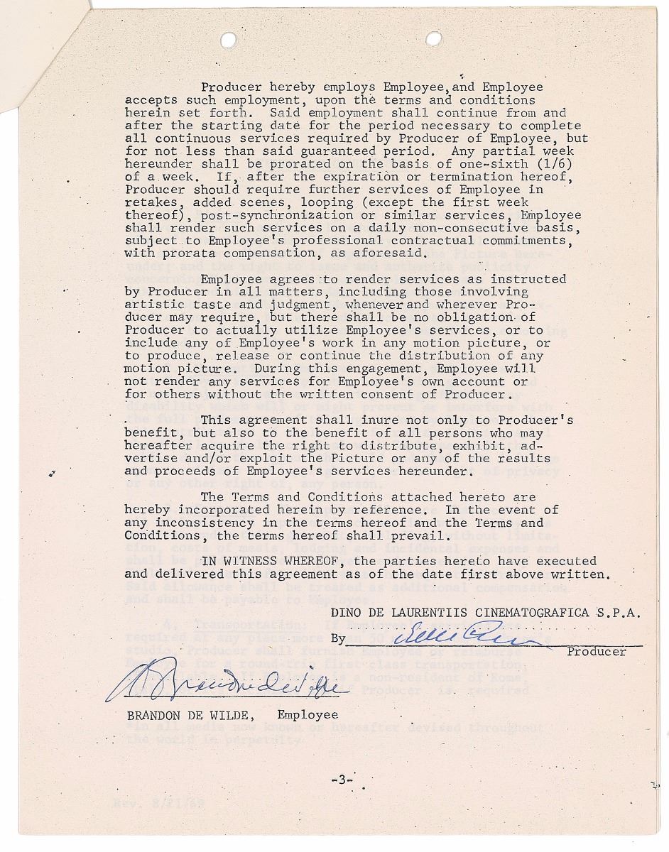 DS, three pages, 8.5 x 11, September 4, 1969. Revised agreement between De Wilde and Dino de Laurentiis Cinematografica S. P. A., in which the former agrees to play the role of “‘Ferguson’” in the picture “‘The Devil’s Backbone’” for a guaranteed compensation of $40,000. Signed at the conclusion of the third page in blue ballpoint by De Wilde. Includes a five-page terms and conditions rider. In fine condition.