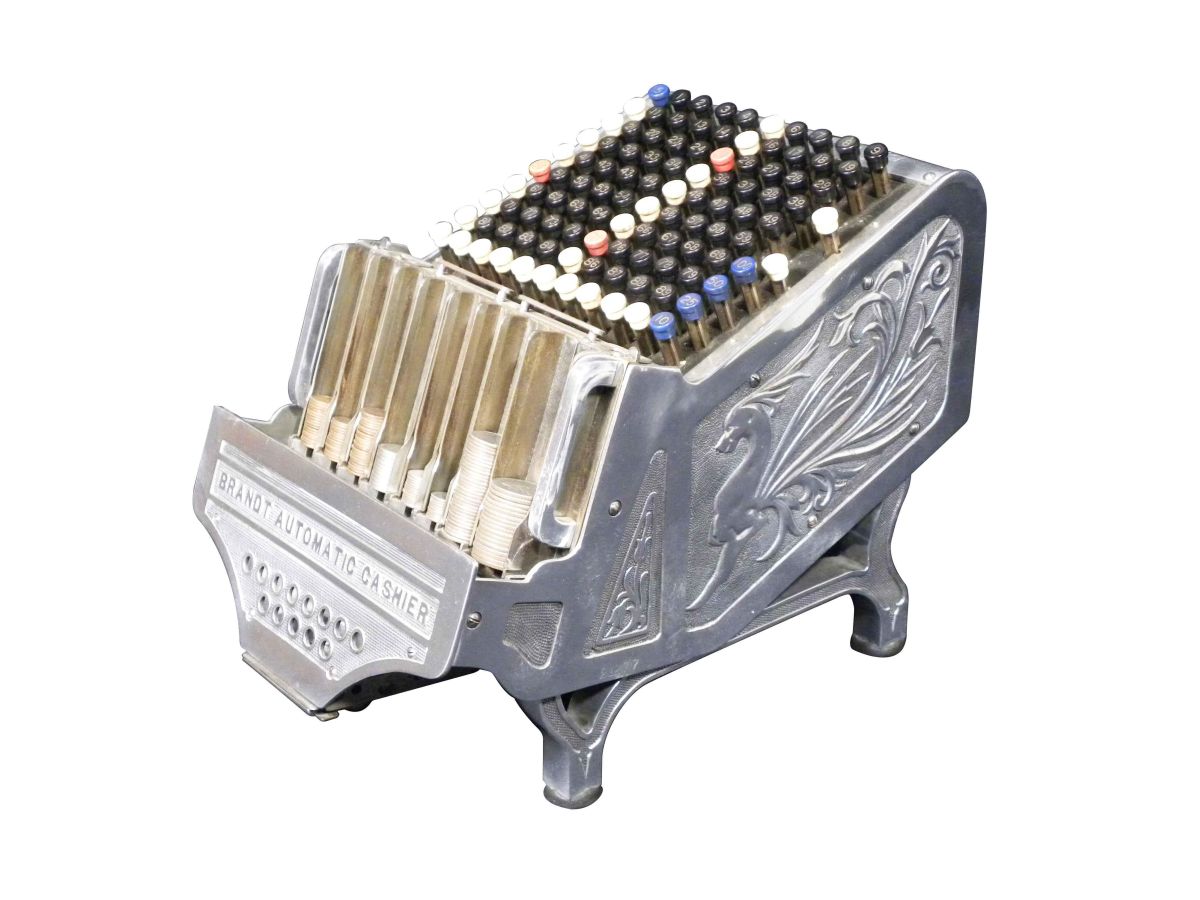 Brandt Automatic Cashier, comes with coins. Nickel plated, serial #21277, patented 1916. Watertown, WI. 9 X 10 3/4 X 14 inches.