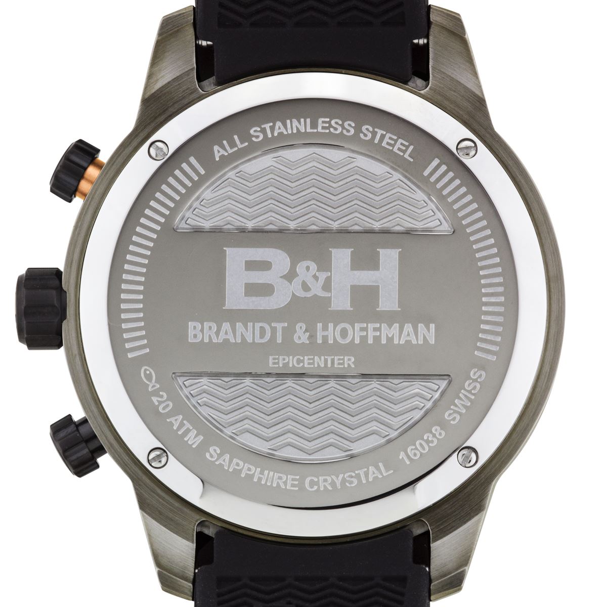 A bold take on a classic design. Apply named Epicenter, as the design inspiration of this watch comes from ripples in the water. As seen in the dial design as well as the comfortable silicone strap, an off center point (the epicenter if you will) ripples throught the rest of the watch. The raised chapter ring a top the rippled texture dial is filled with BGW9 Superluminova markers, making it perfectly visible in little to no light. Inside the large but not bulky 48mm case lies the true epicenter of this watch. The Swiss Ronda 5020.B Movement accurately provides the time and date as well as chronographic complications. Unique and just flat out cool, the Brandt & Hoffman Epicenter is a must have.