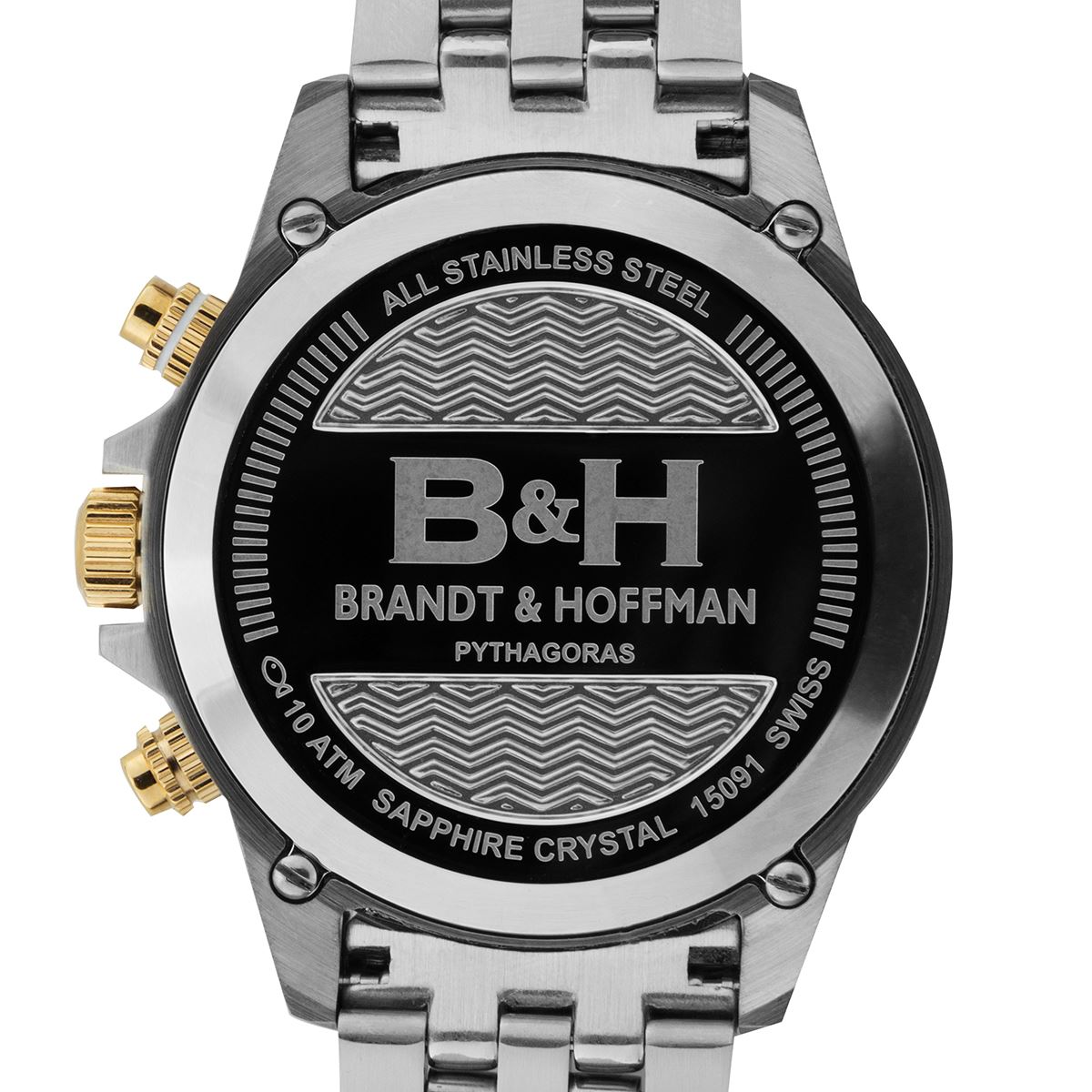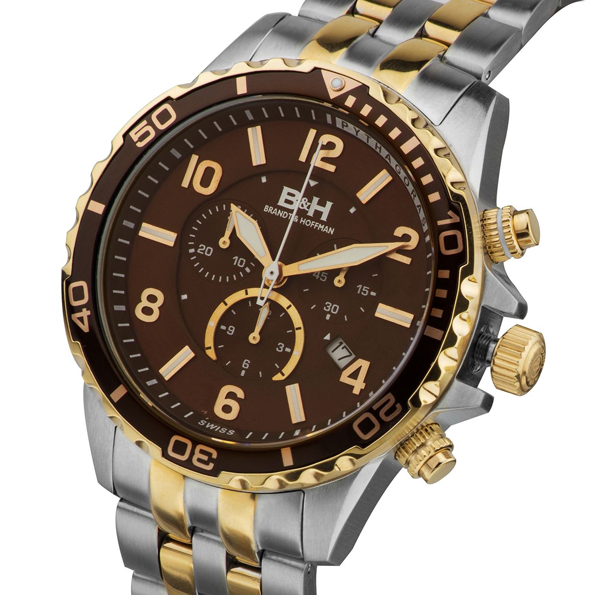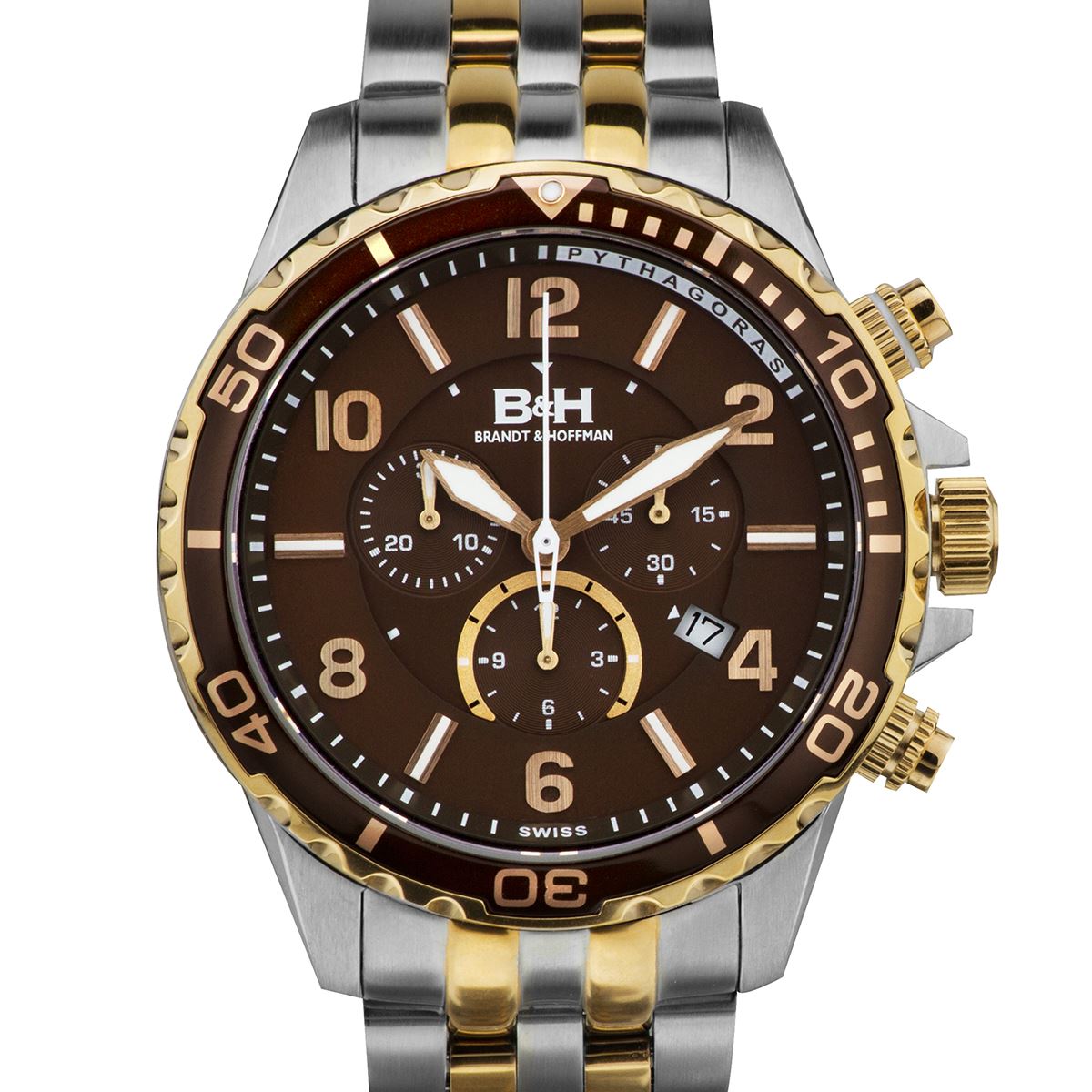Coming off of the biggest year in Brandt & Hoffman history, the Pythagoras is evidence that B&H doesn't rest on its laurels. A completely new sport design featuring the finest workmanship, fit & finish ever displayed in a B&H watch, the Pythagoras is a shining achievement for the brand. The multi.level dial is finely appointed with touches of color to create an accent, rather than overrun the design with color. Each Arabic numeral is hand.placed onto the satin finished dial ring, and the 6 o'clock subdial discreetly disappears underneath the ring to create a wonderfully deep 3.Dimensional effect, even though the entire watch is only 12mm in height. Protecting all of this is an anti.reflective coated Sapphire crystal, and the precision is handled expertly by the Swiss made Ronda 5030.D movement inside of the 100 meter water resistant case. Wrapping all of this up on your wrist is a massively thick, multi.link stainless steel bracelet with a diver's fliplock safety clasp for security. Hands: Luminescent Caseback Type: Screw.down Age: Adult Strap Color: Rose.Tone Type: Analog, Chronograph Caseback Material: Stainless Steel Product Features: Calendar Date, Water Resistant Material: Stainless Steel Case Shape: Round Case Thickness: 12mm Strap Width: 22mm Strap Movement: Swiss Quartz Strap Length: Adjustable Dial Color: Brown Case Diameter: 45mm Crown: Screw.down Gender: Male Closure Type: Deployment Water Resistance Depth: 100 Meters Dial Window Material: Sapphire Coated Mineral