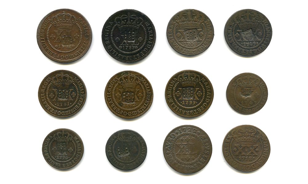 João V: XX Réis 1718 (09.05; AI C035) BC+; XL Réis 1722 (17.01; AI C060) BC; João, PR: Carimbo “escudete” sobre X Réis 1749 D. João V (51.01; AI C065) BC; XX Réis 1749 D. João V (x2)(70.01; AI C067) BC+; XL Réis 1781 Maria I e Pedro III (94.01; AI C256) coroa baixa BELA; XX Réis 1781 Maria I e Pedro III (81.02; AI C251) coroa baixa MBC; 1782 (82.03; AI C278) coroa alta MBC; XL Réis 1787 Maria I (97.02; AI C349) coroa alta MBC; XX Réis 1799 Maria I (83.05; AI C317) coroa baixa MBC; X réis 1790 Maria I (x2)(63.03; AI C306) coroa baixa MBC