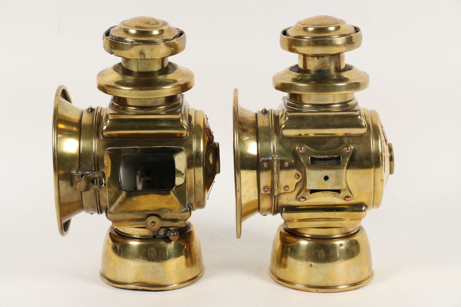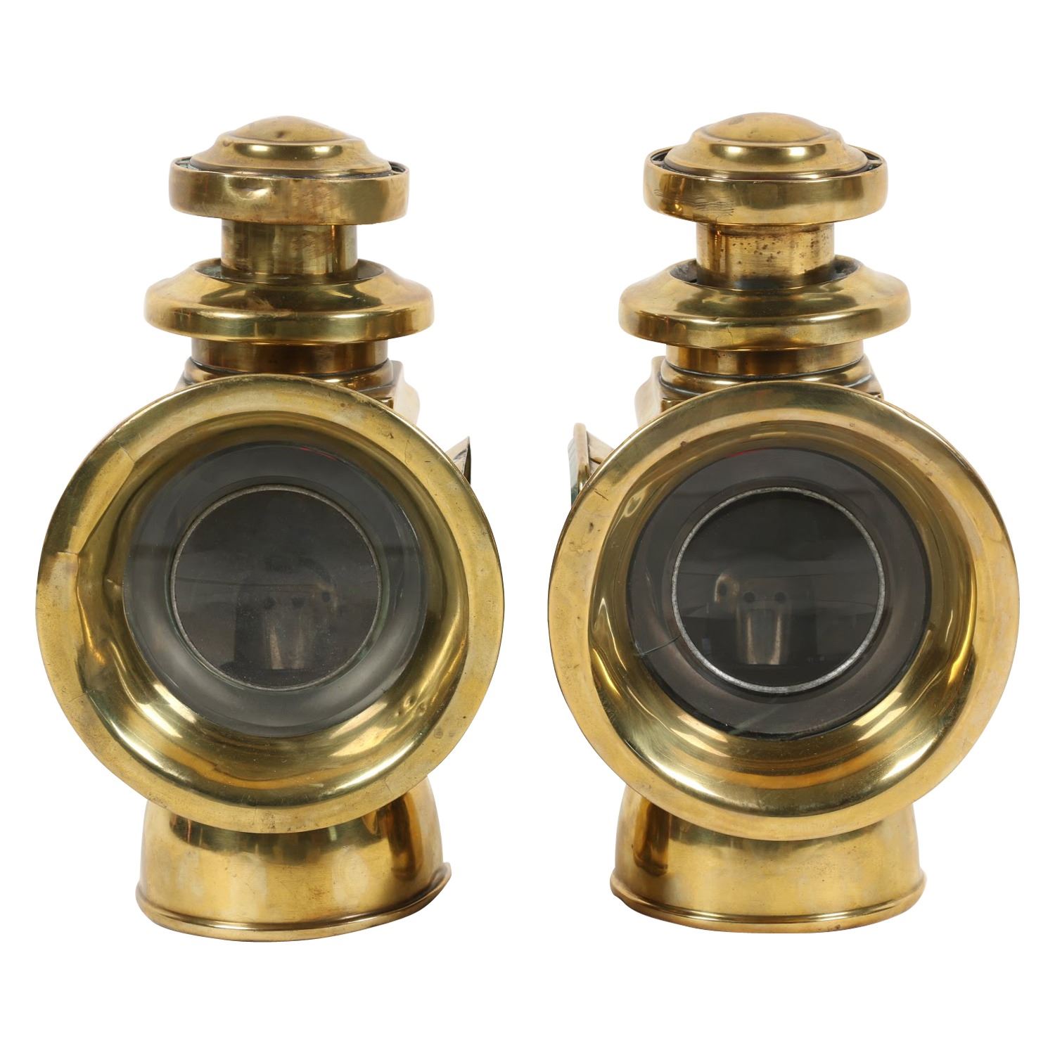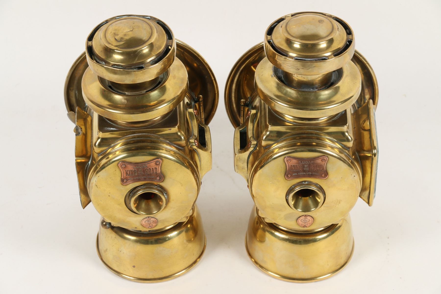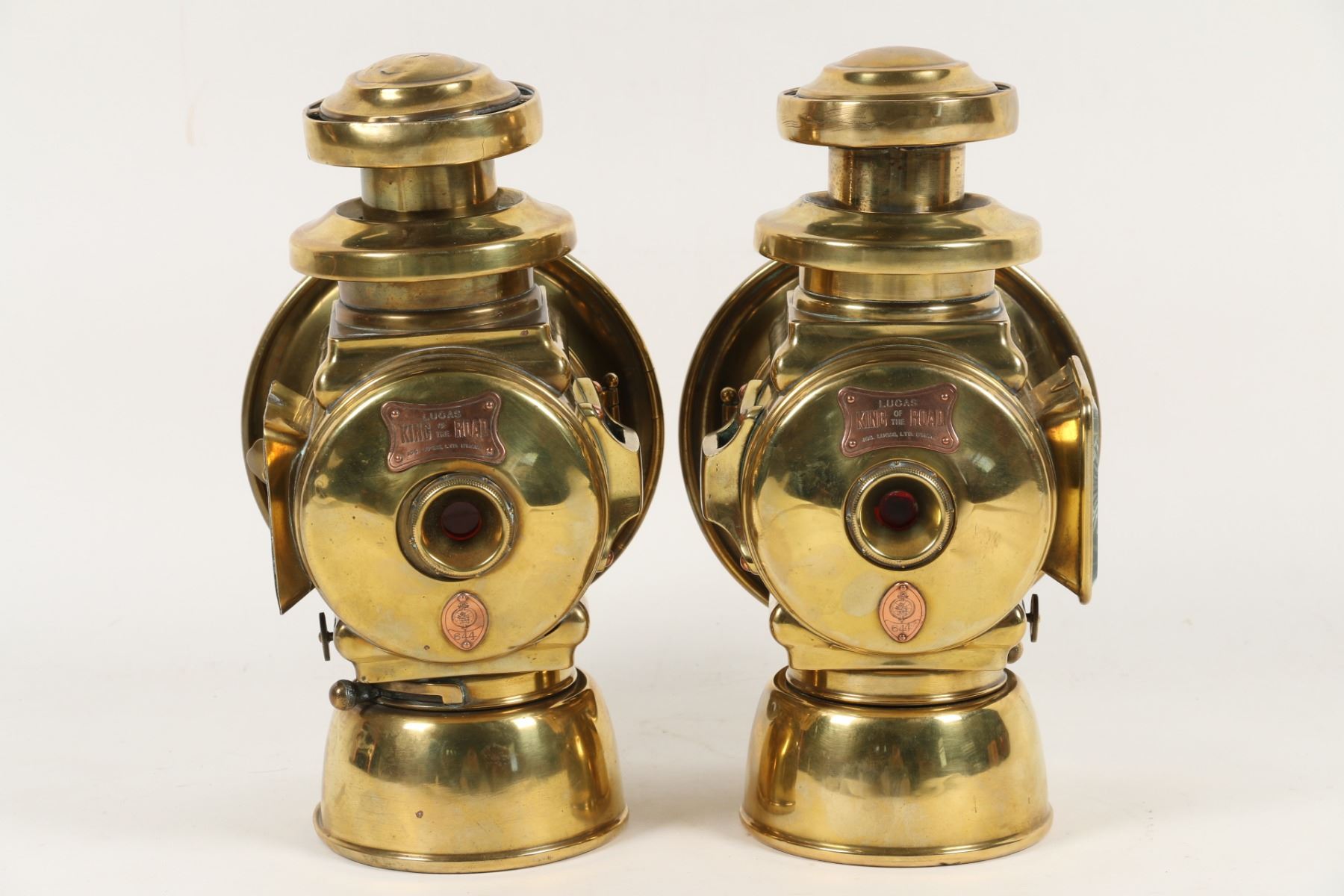 Matched pair (right and left). Lucas "King of the Road", Birmingham, England. 12.5" x 7.5" x 7" each. Shallow dents. The outer section of one lens has a hairline crack. One lamp requires cut glass side window. Professionally polished. $400-600.