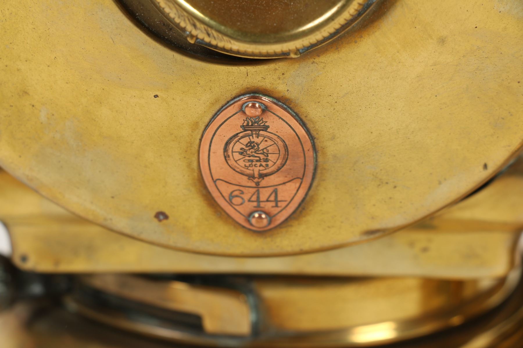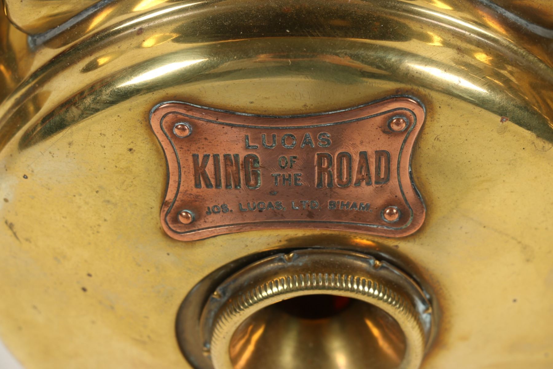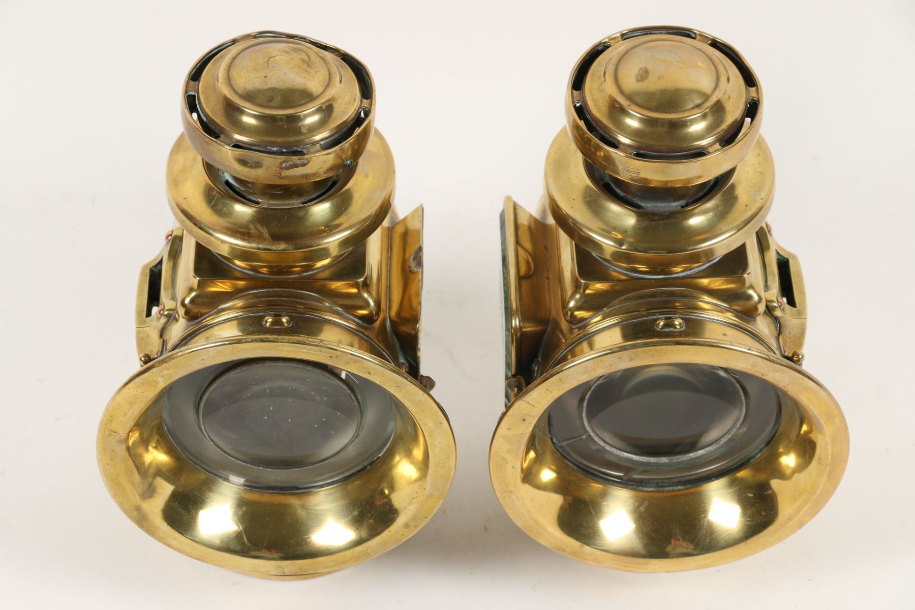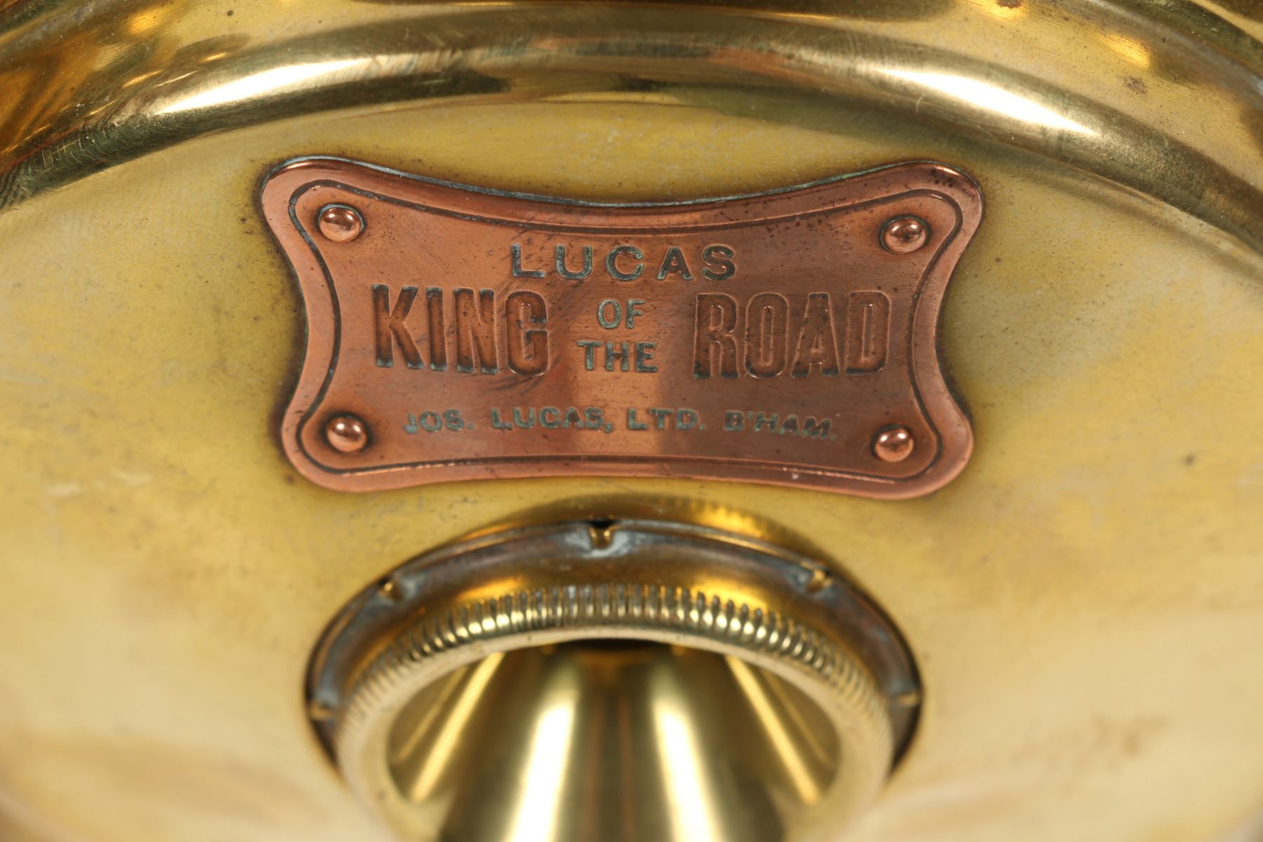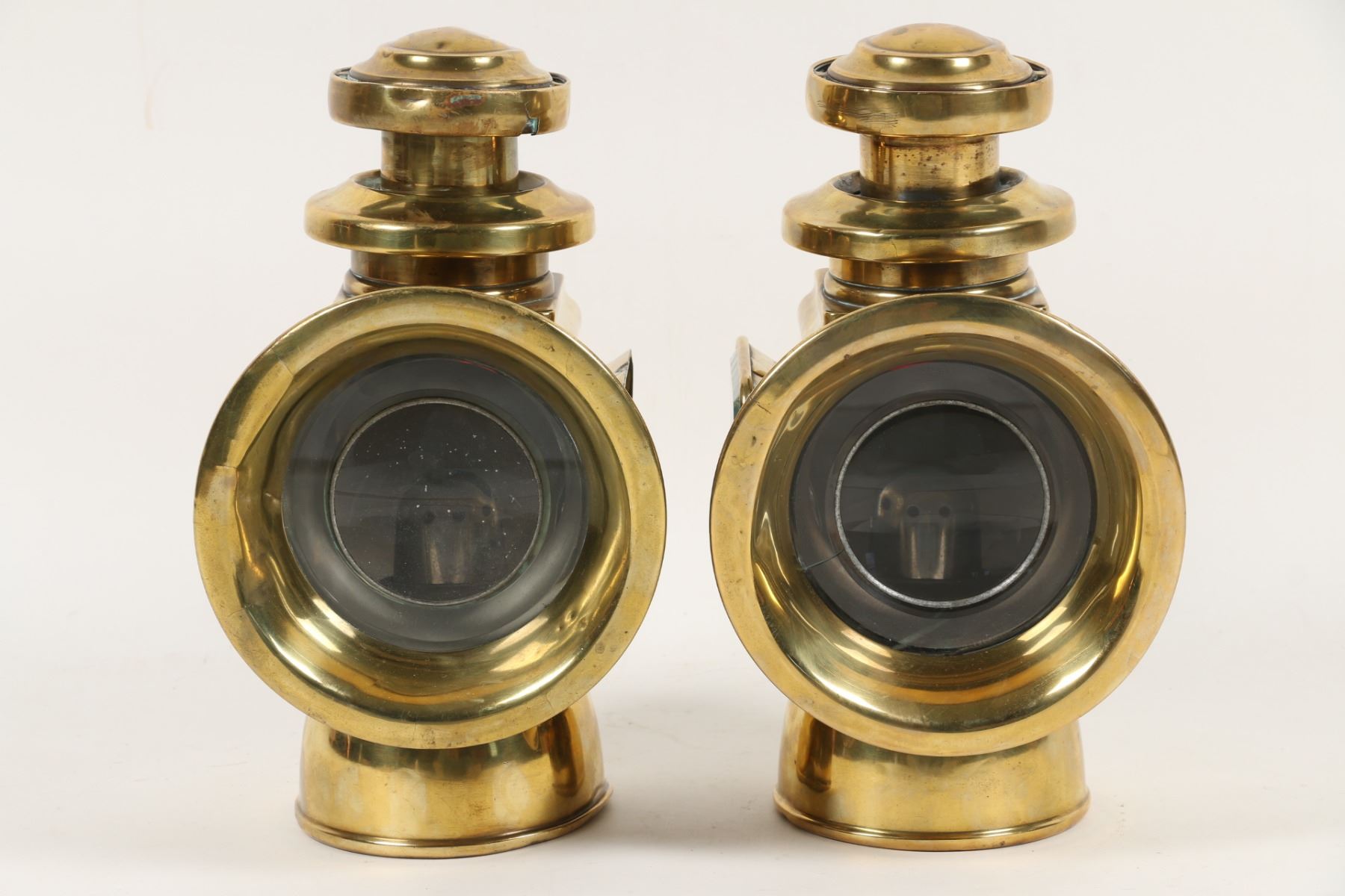 Matched pair (right and left). Lucas "King of the Road", Birmingham, England. 12.5" x 7.5" x 7" each. Shallow dents. The outer section of one lens has a hairline crack. One lamp requires cut glass side window. Professionally polished. $400-600.