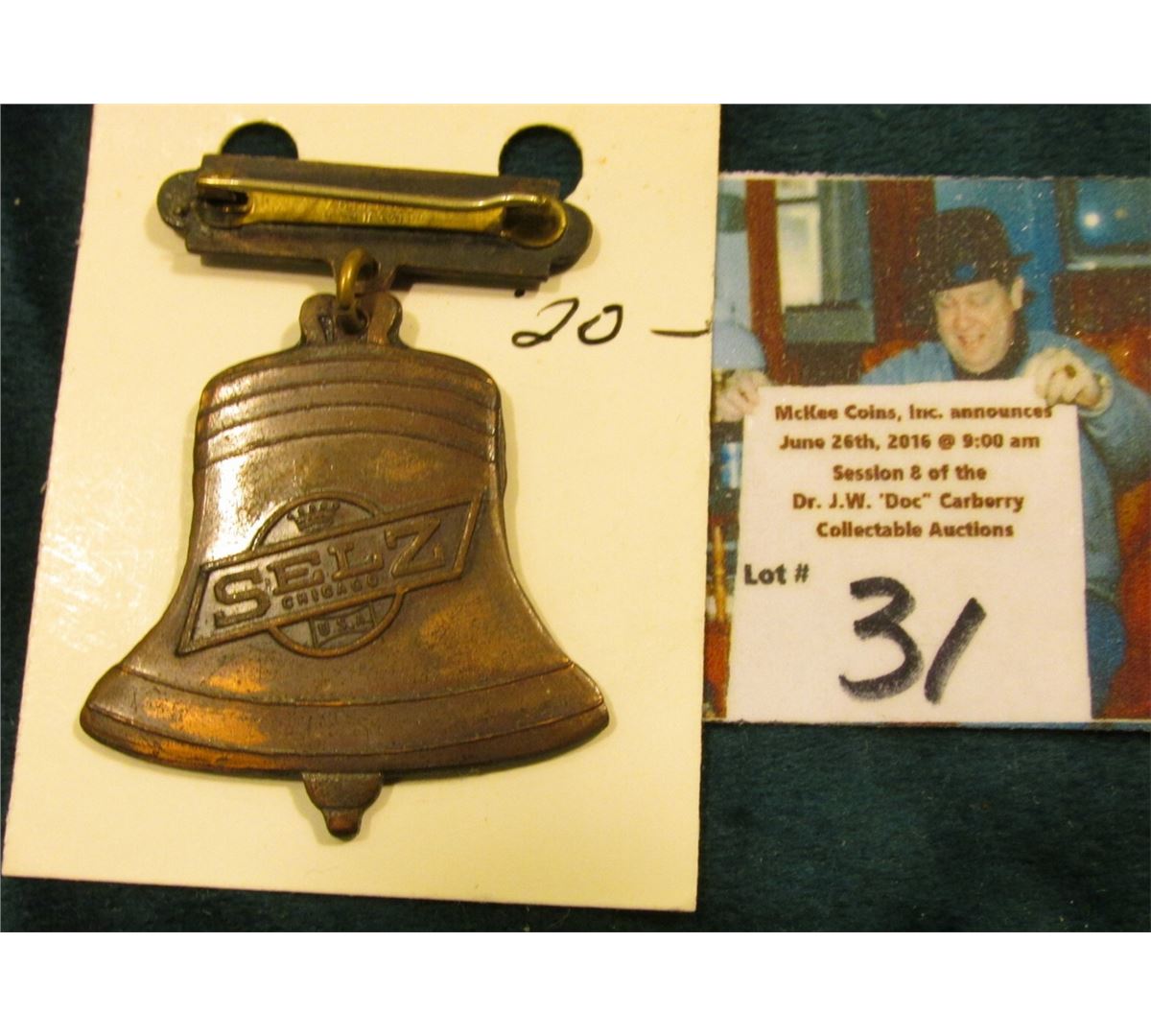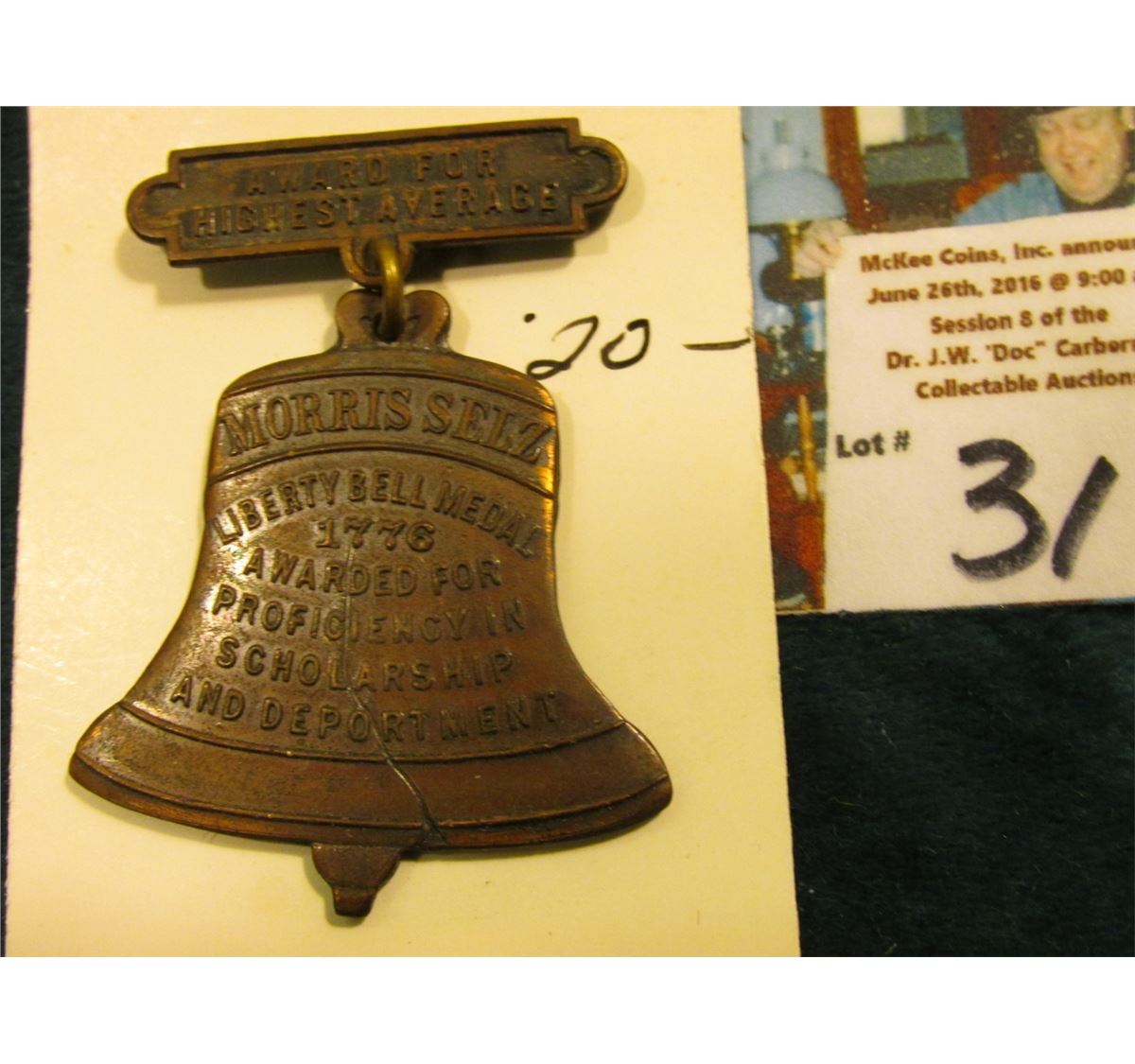 Brass Badge with Bell-shaped Dangle "Award for Highest Average", "Morris Selz Liberty Bell Medal 177