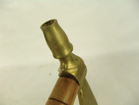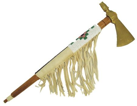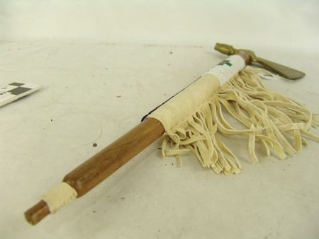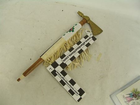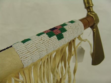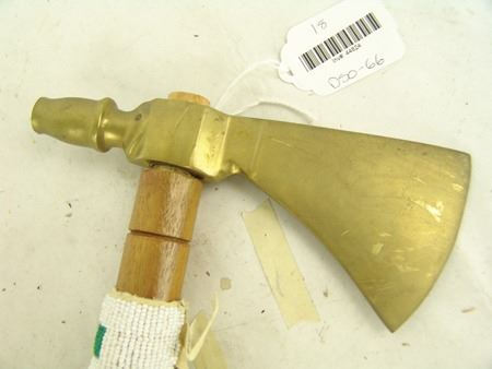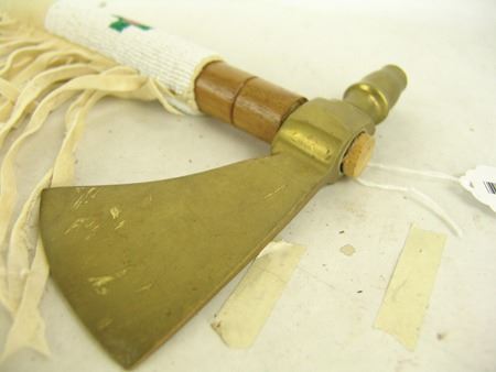 Late 1900s, Forged brass pipe tomahawk with round wooden haft/stem and lazy stitch beaded section with fringe. Very good condition. 18"