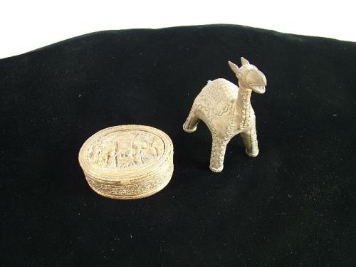 England and Egypt (Late 19th Century) English brass box with garden scene relief, 1 1/2" by 4". Egyptian brass camel decoration, 5" by 3".