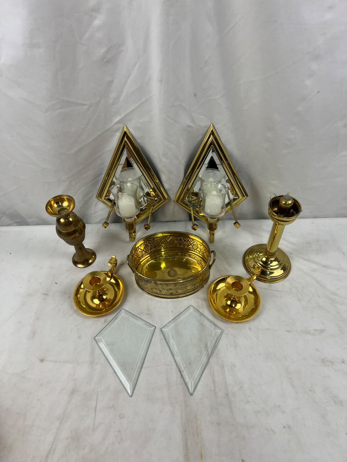 Sconces measure 11" tall and mirrored portion can be swapped for glass.