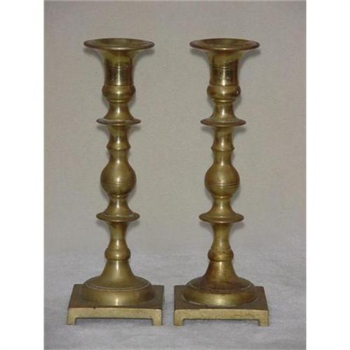 A pair of solid brass candlesticks, 9 1/2'' tall, 3 3/8'' square base. Shaft screws into base. Handsome pair, can use a polishing.