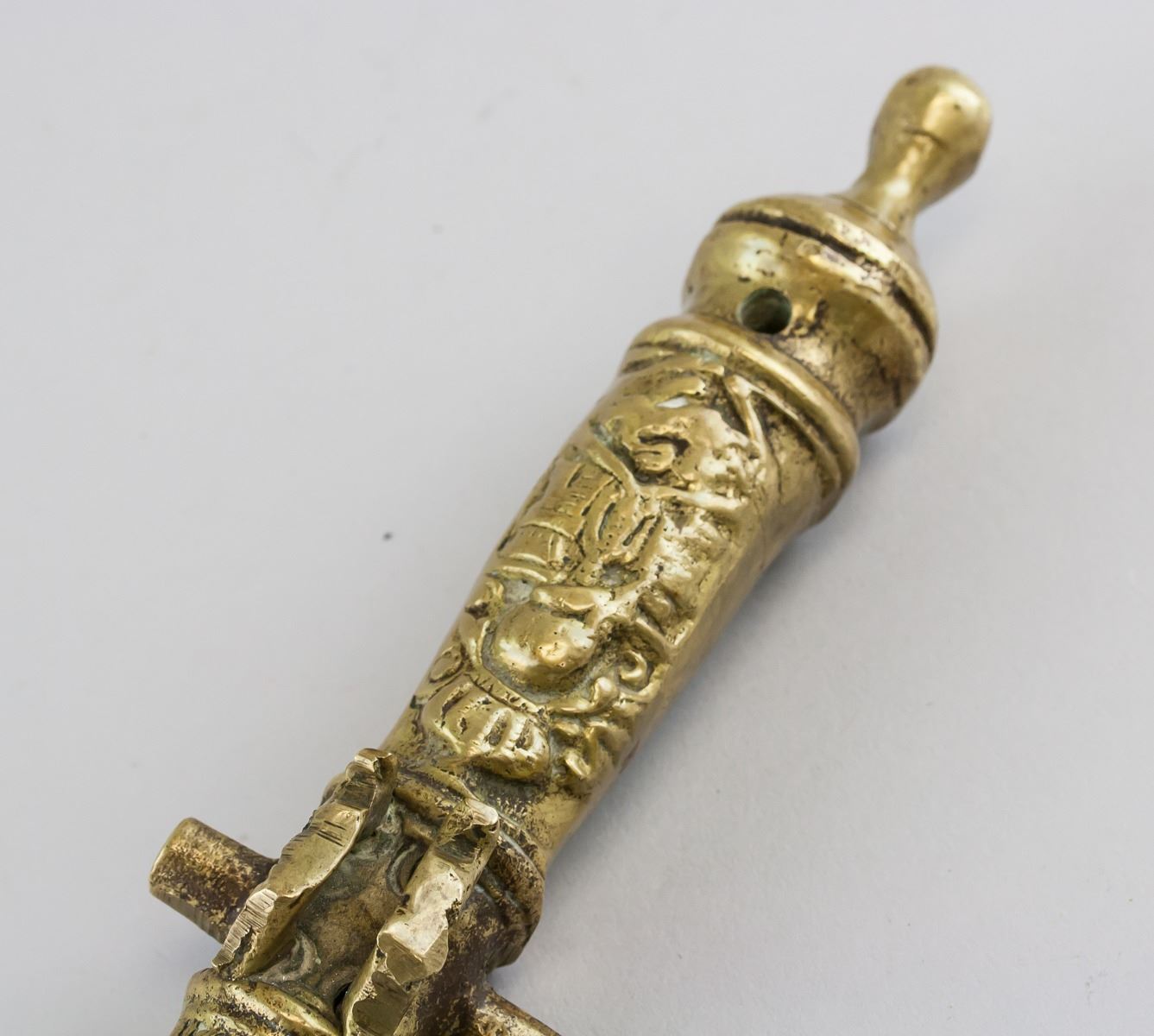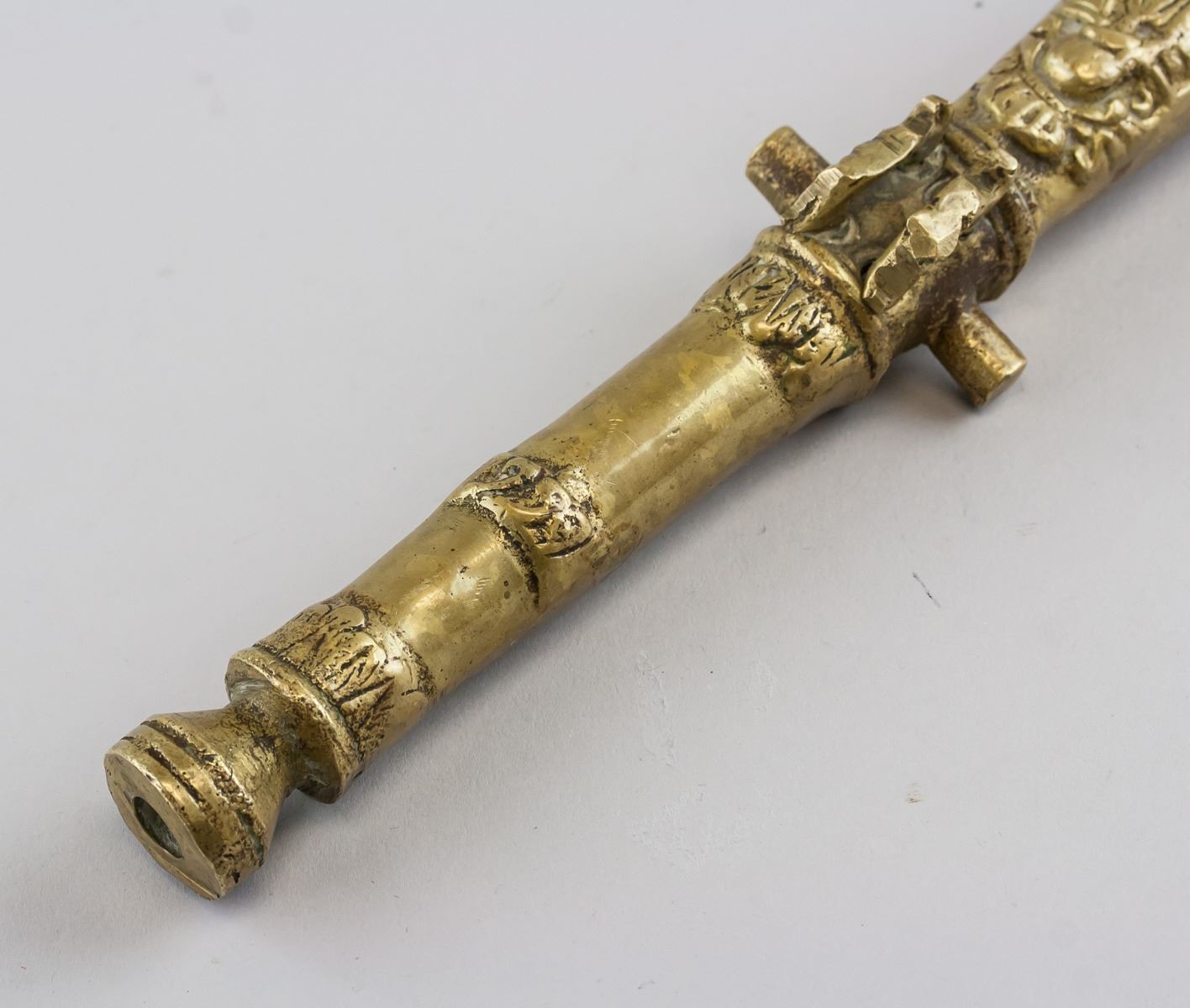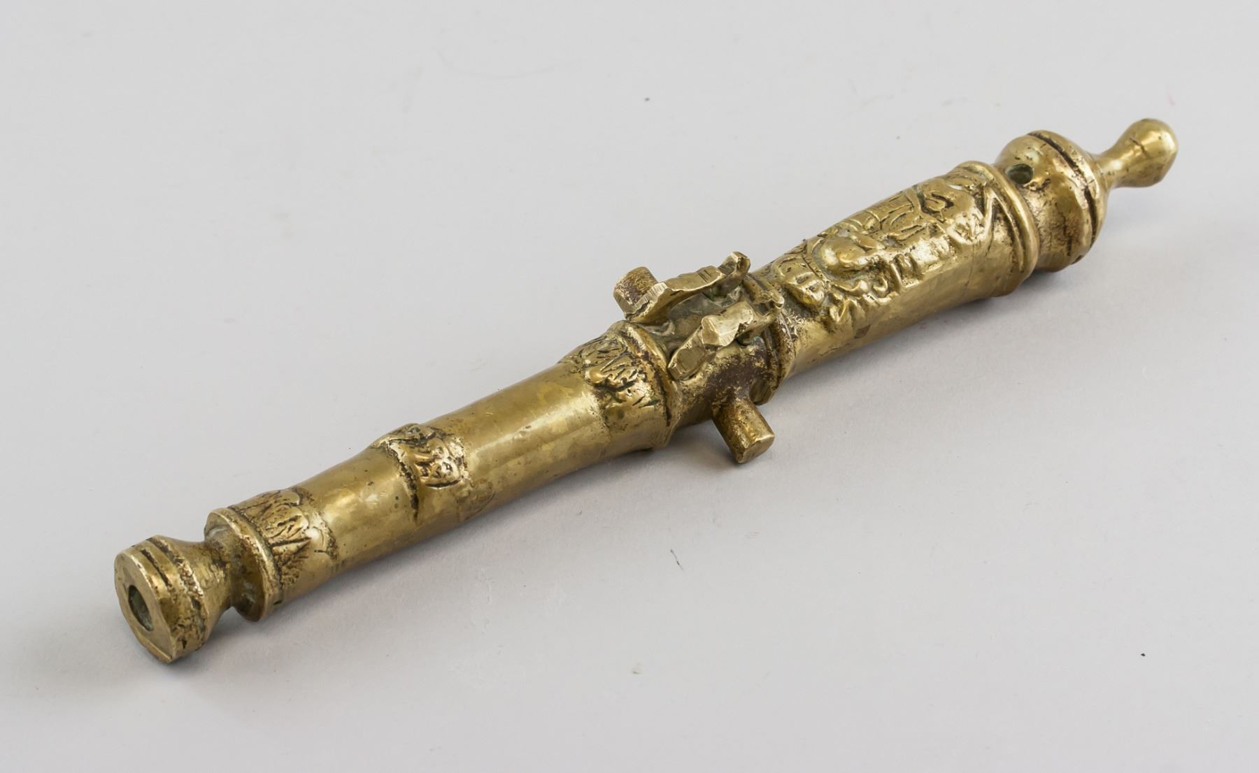 Brass smoking pipe. Of canon form. Carved with abstract designs. 26 x 5 cm, 892 grams