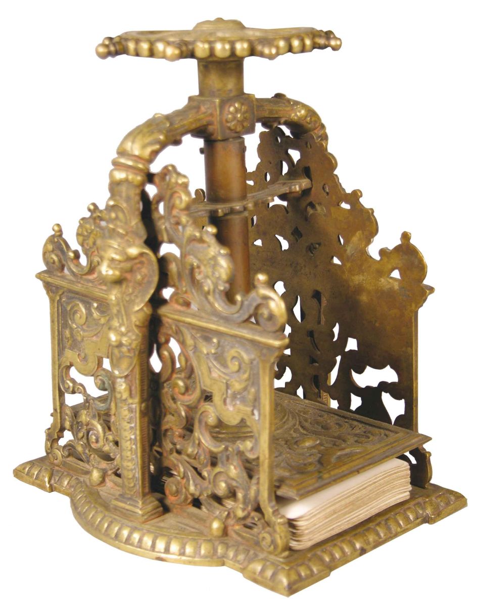 Brass Card Press, fancy repose scroll work and design, cir. 1870. Very good condition. Measures 6 1/4 inches tall.