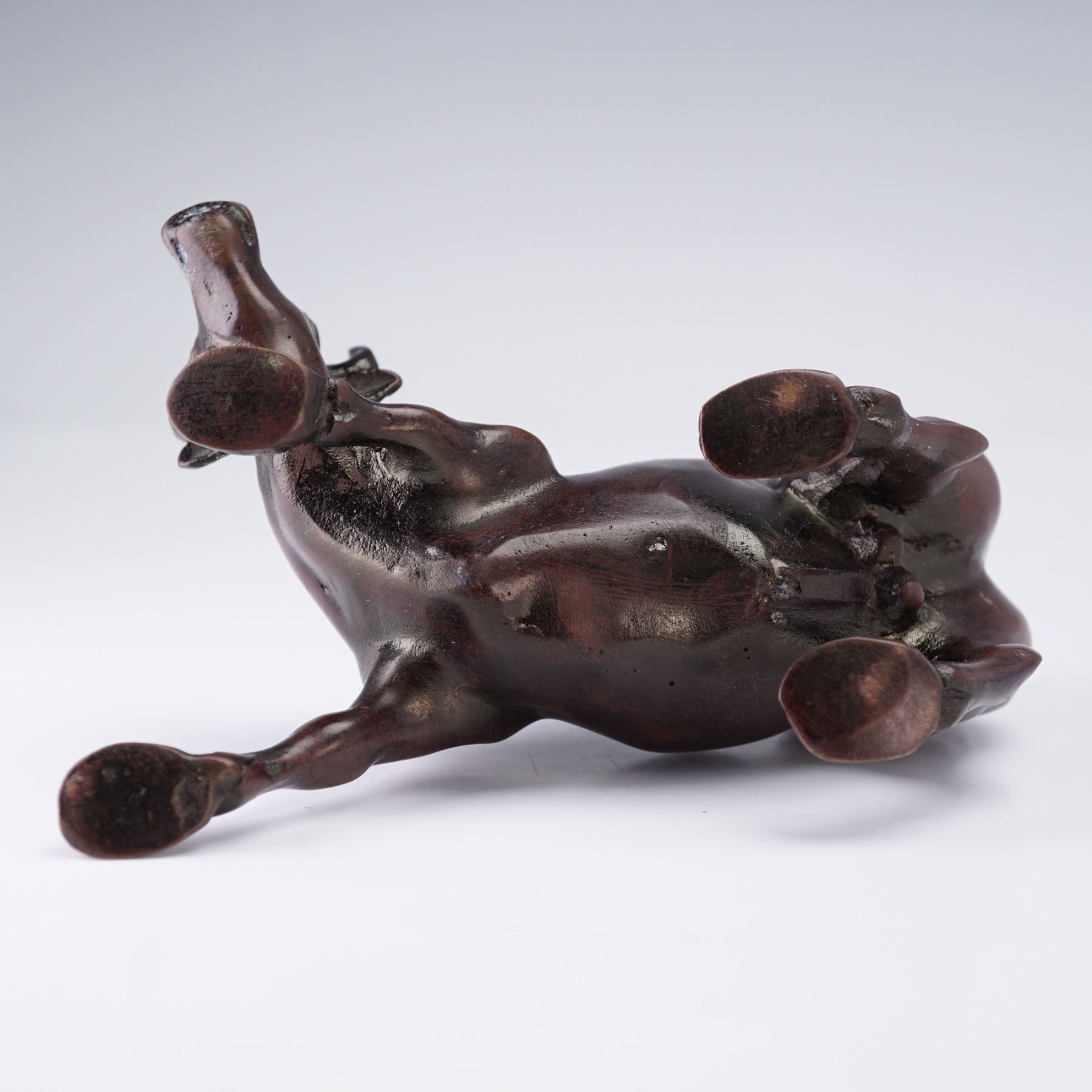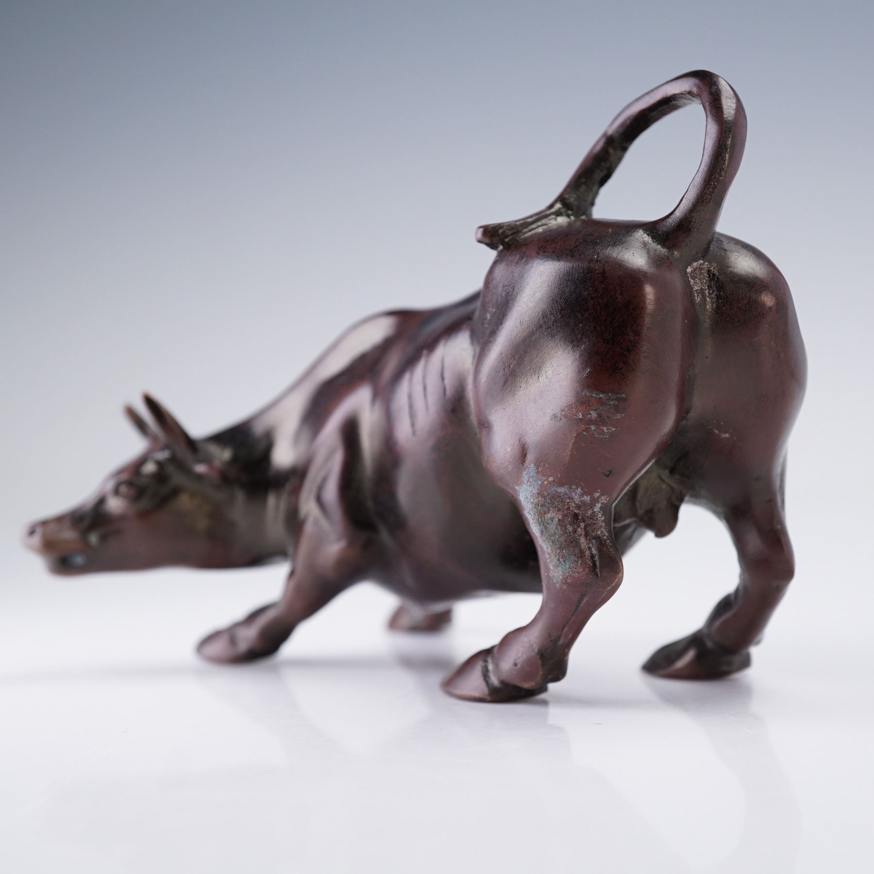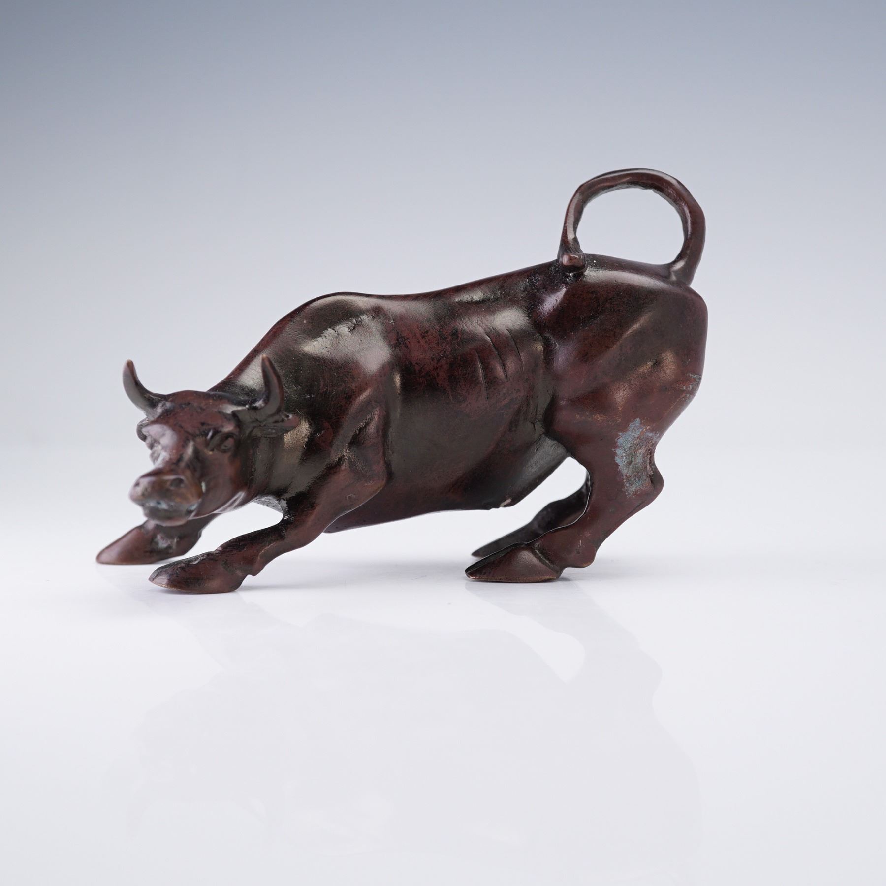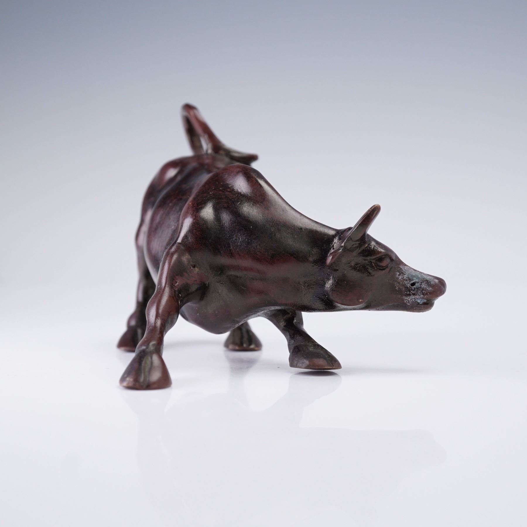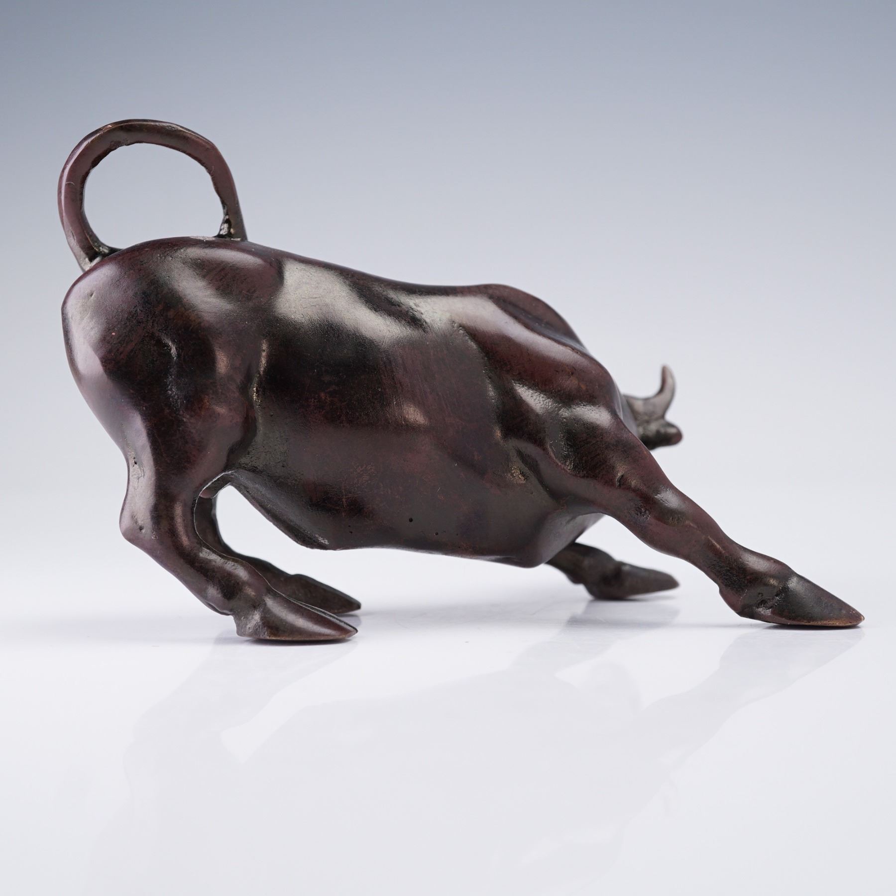 Finely cast in solid brass with a rich dark patina. The figure captures the dynamic stance of a bull in motion, with lowered head, muscular body, and arched tail, embodying strength and determination. Designed as a decorative paperweight, this piece displays strong sculptural detailing and serves as a bold accent for desk or shelf.