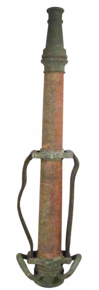 Brass Clay Pipe Fire Nozzle. Rare leather handles and red cord piping. A.J. Morse & Son, Boston, Mass maker on base. 8-1913. Very good condition. 30 inches tall.