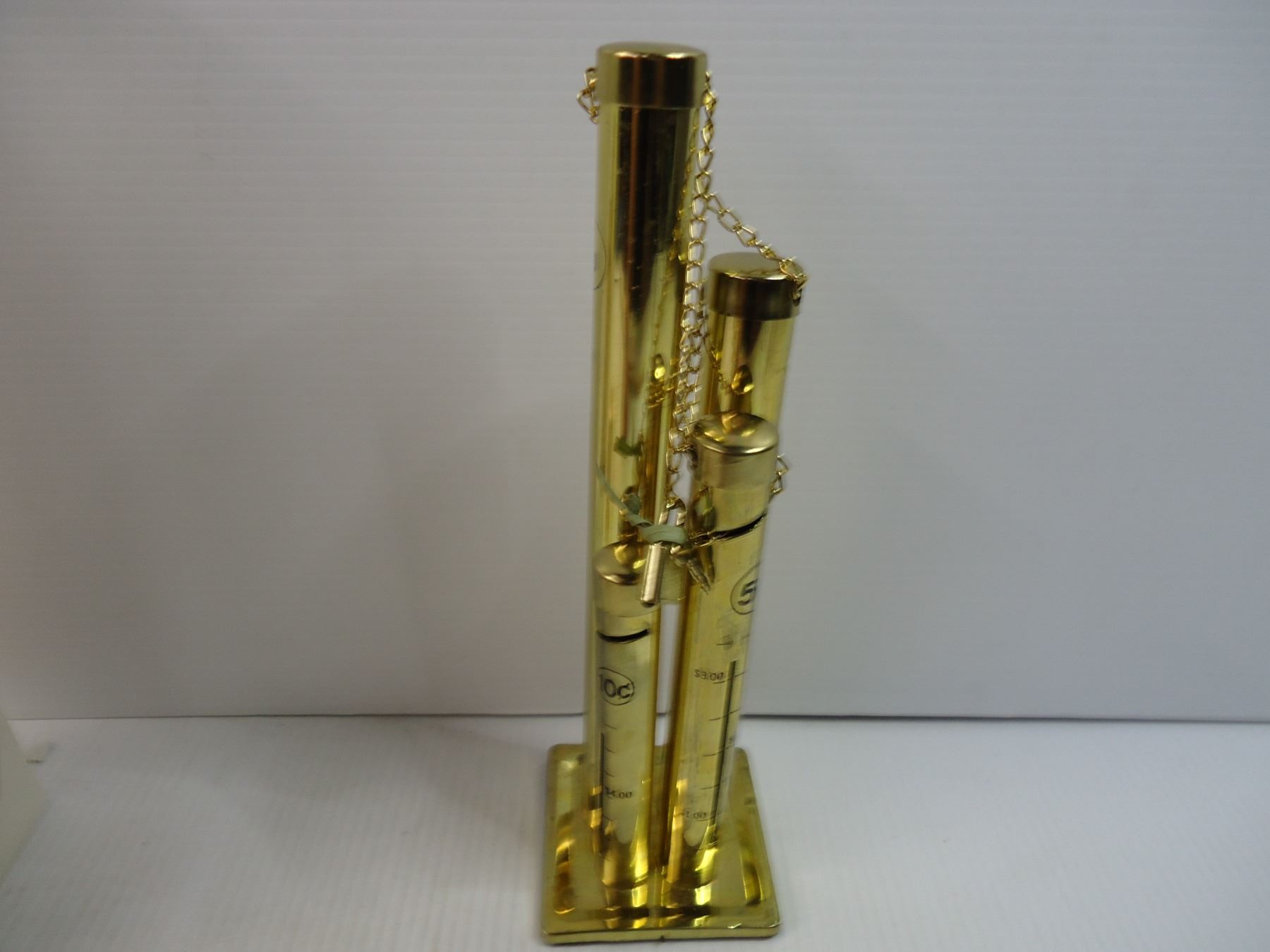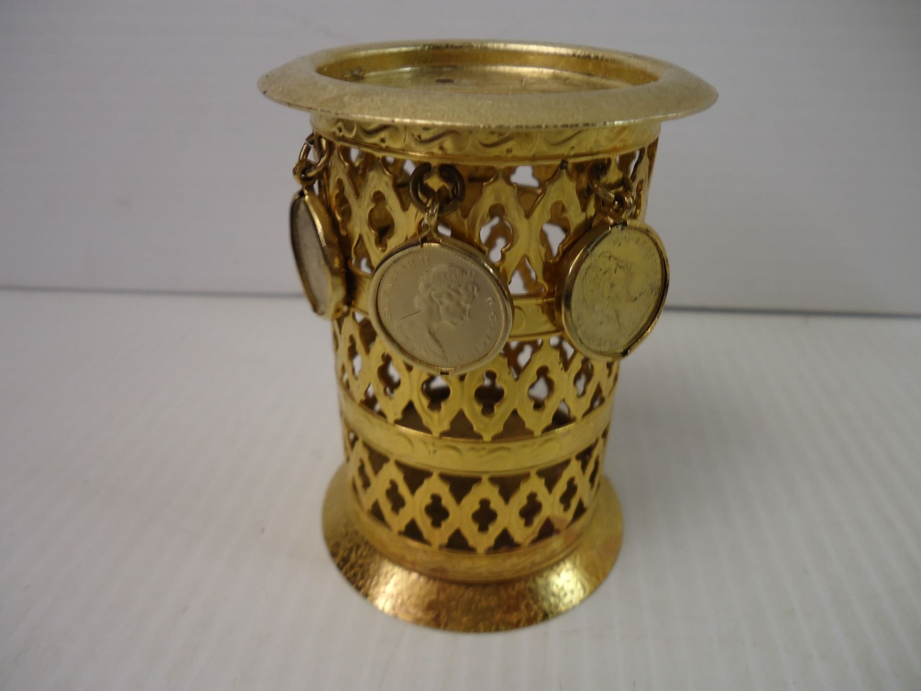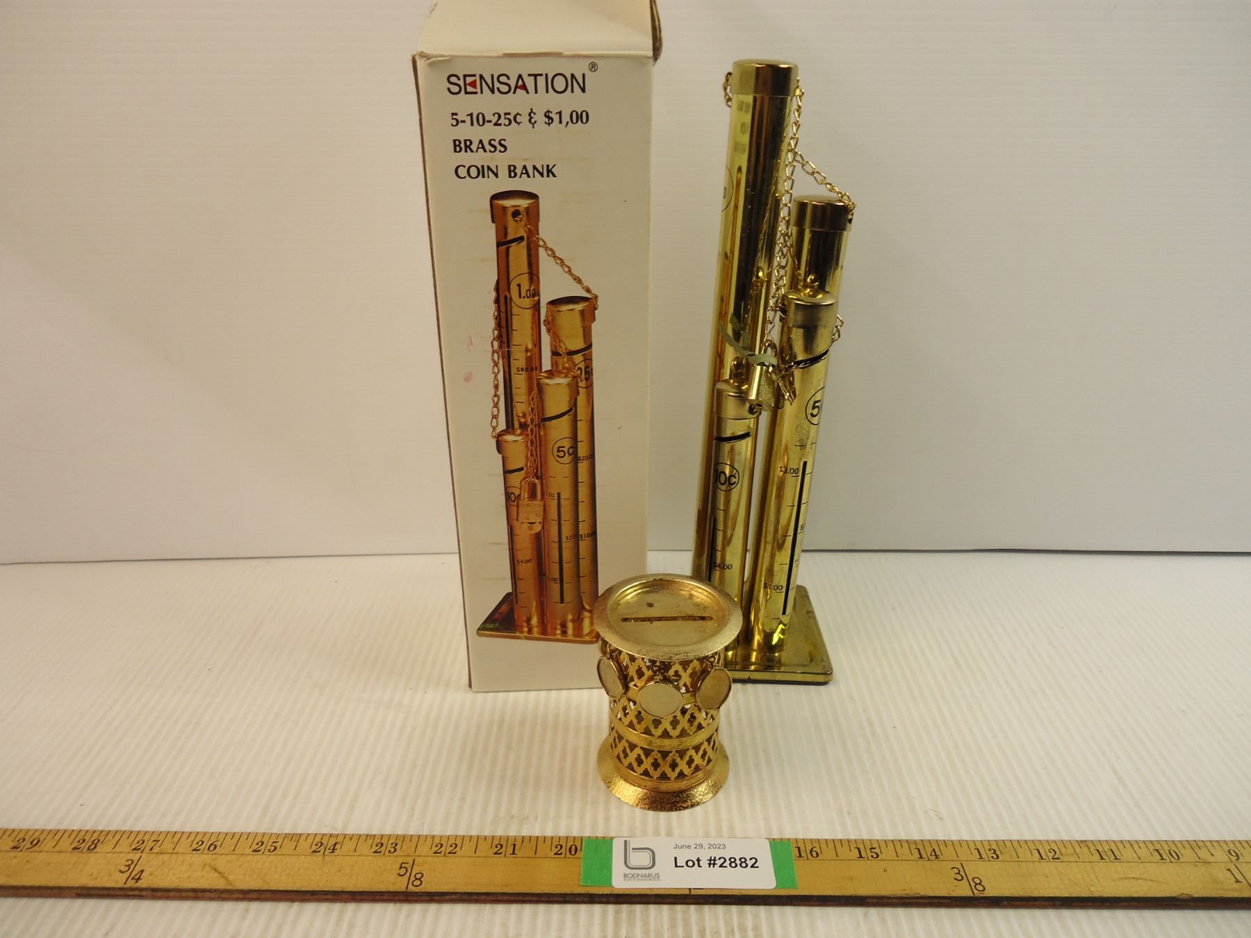 Brass Coin Bank in Box and a Change Collector with Dangling Coins