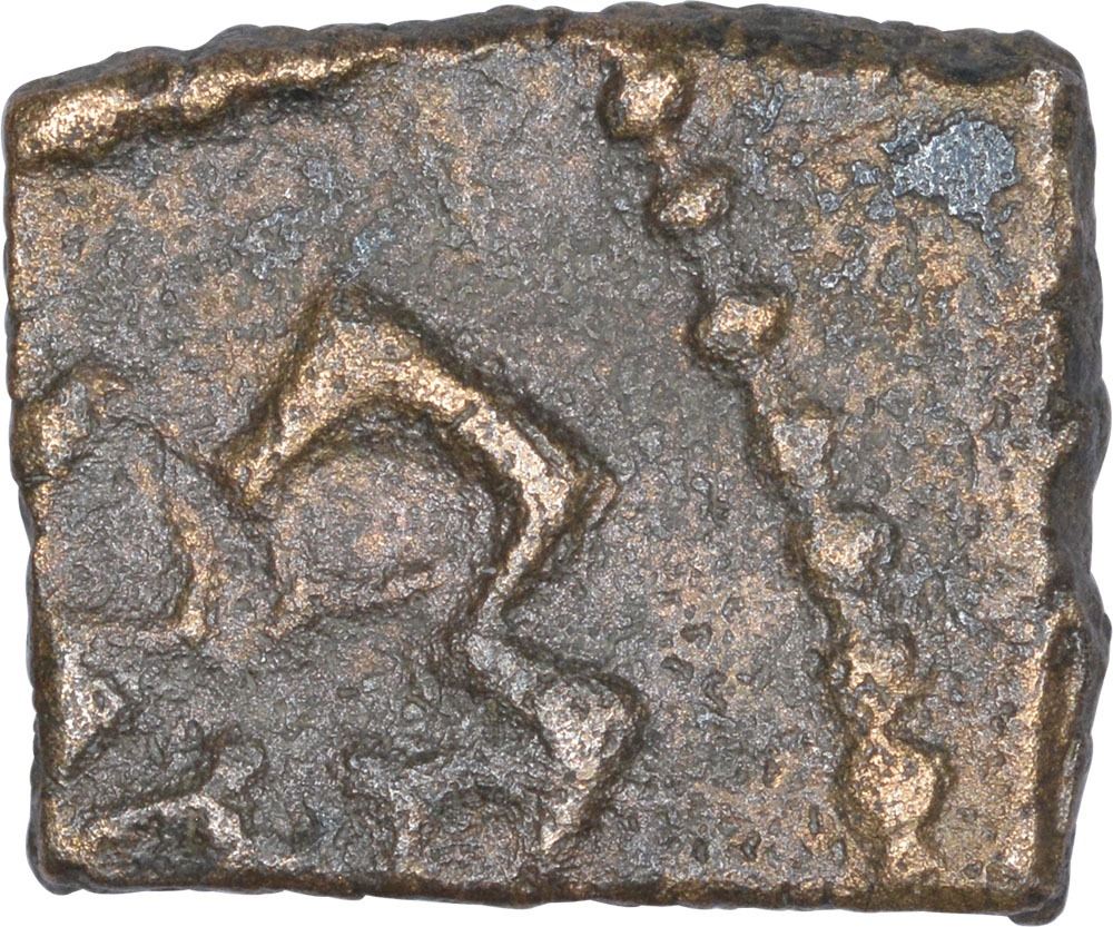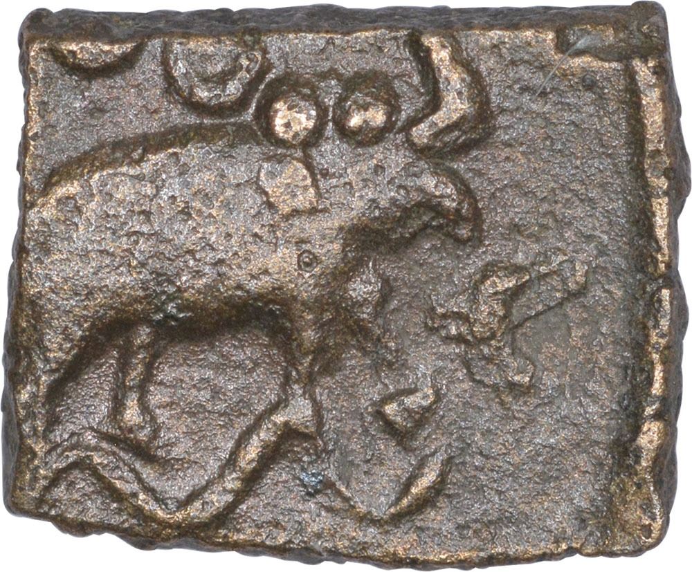 Mitra Dynasty of Khandesh (100 BC), Brass 1/4 Unit, Obv: elephant walking right above river, ujjaini symbol top,Rev: hollow cross in center within dotted square, taurine inside hollow cross, 1.10g, 10.03x8.25mm, about extremely fine, Rare.