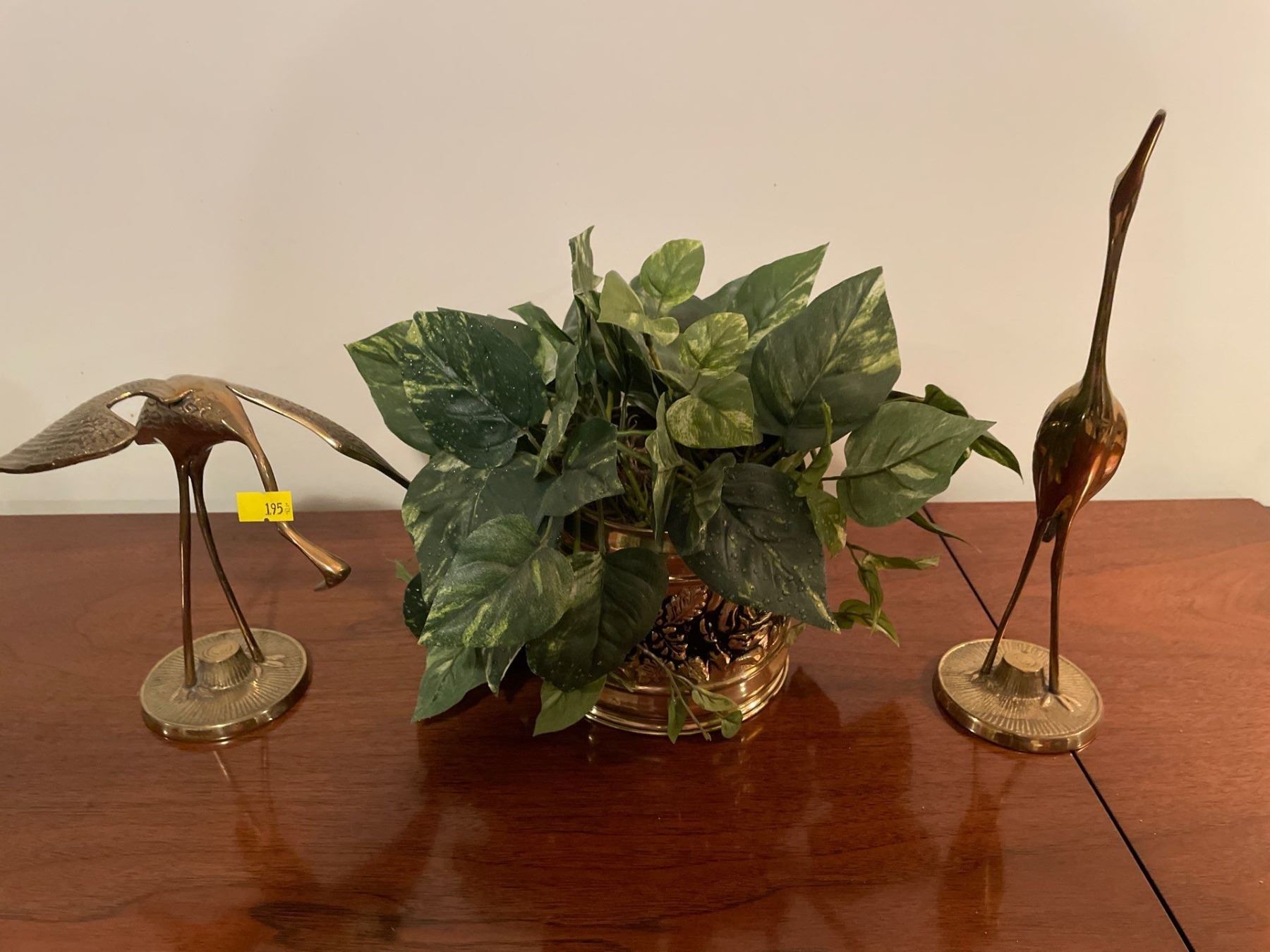 Brass Collection of Inside Home Decor, Heron Statues x 2 & Artificial Prayer Plant in Gold Container