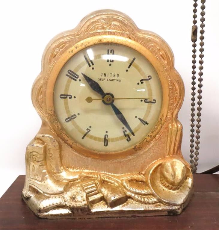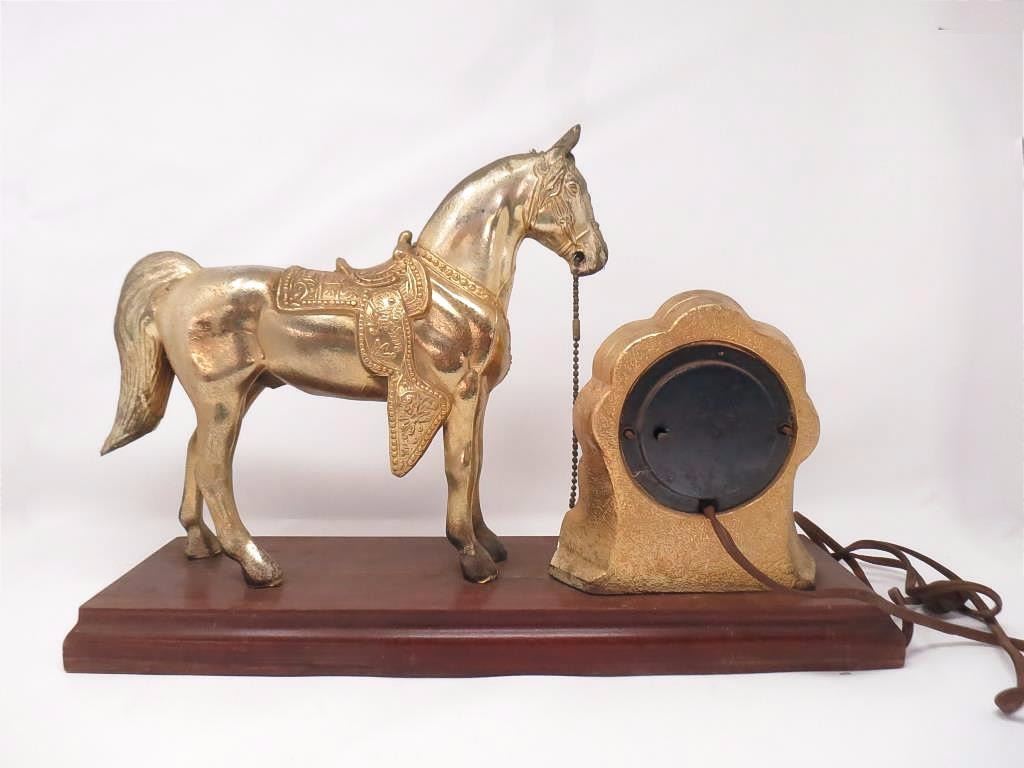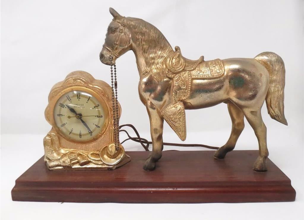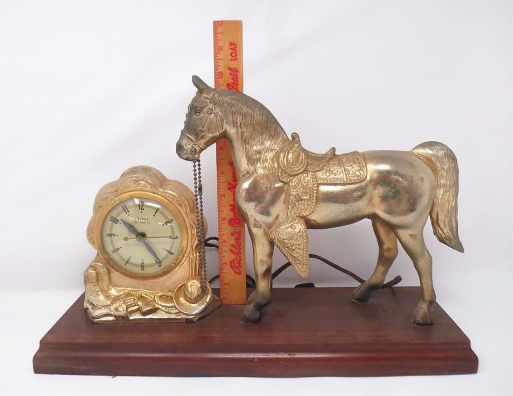 Clock sits in brass colored setting of boots, revolver, rope, and cowboy hat standing about 6.5". Brass colored horse wearing ornate saddle stands 10" high.