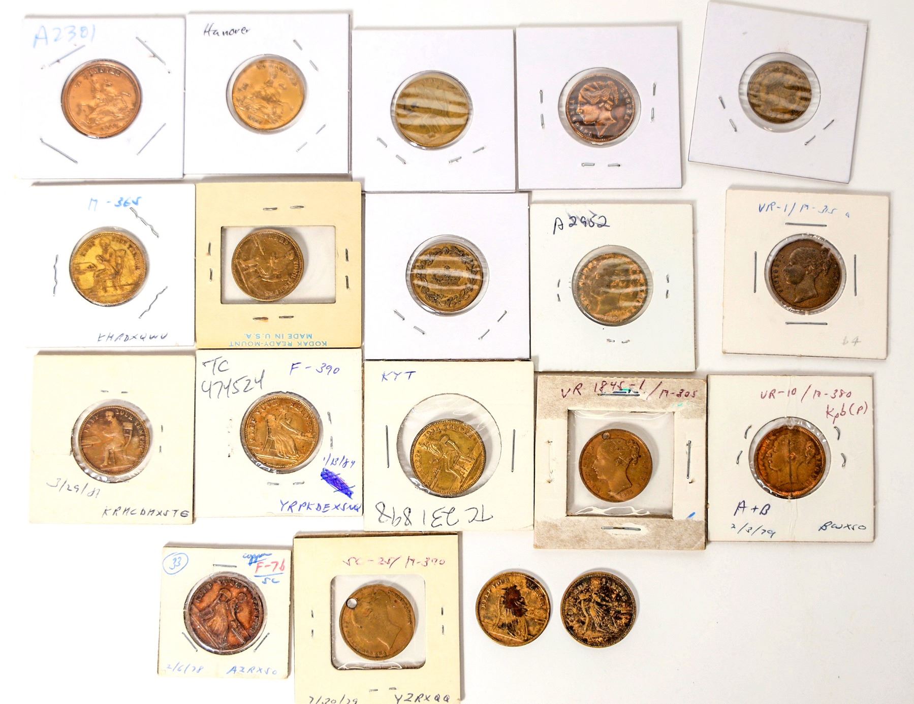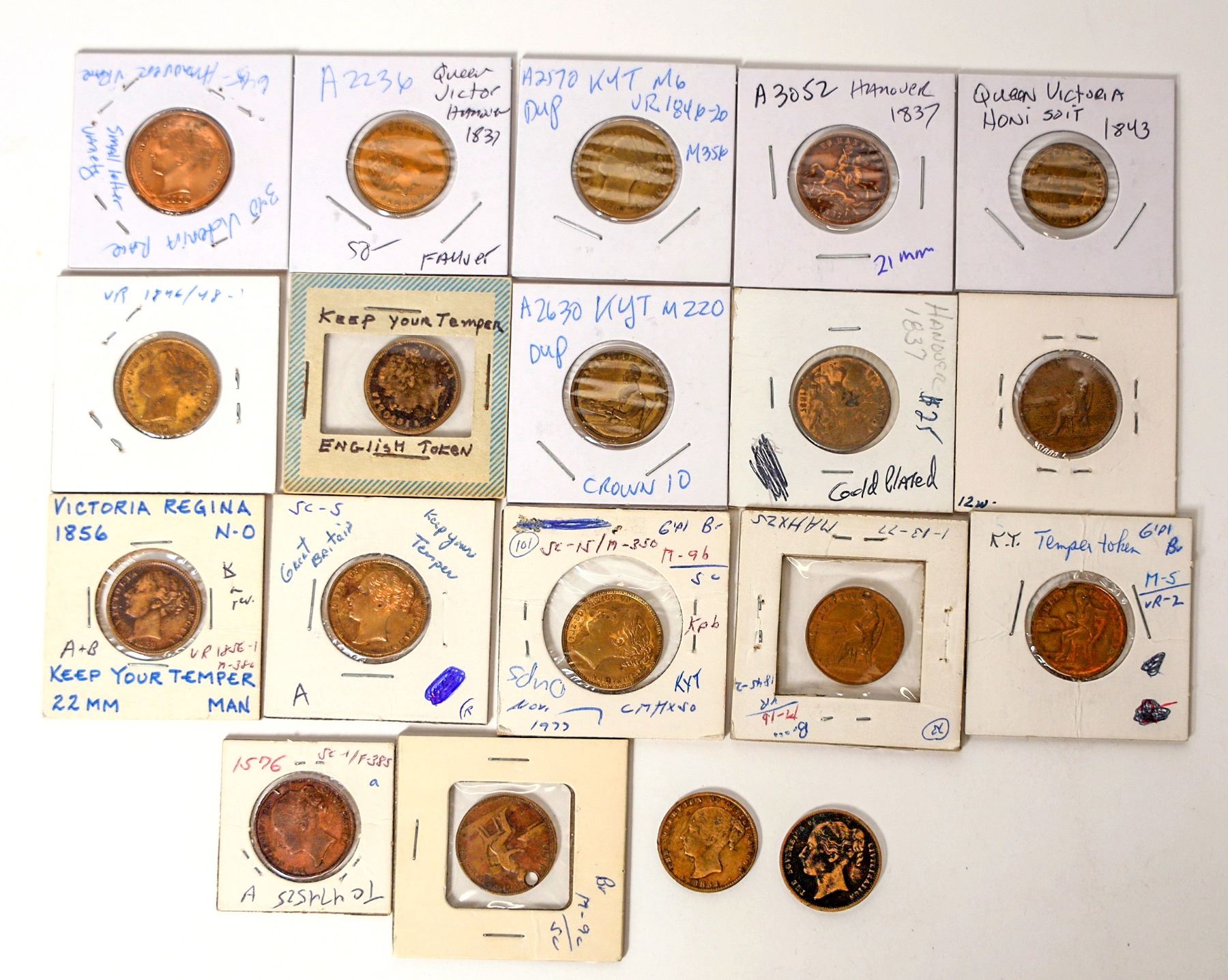 Ever played the game of Whist? Me neither, but tempers could occasionally flare, and 14 of these brass gaming counters bear the words KEEP YOUR TEMPER on the reverse with either a man facing left or a woman facing right at either end of a table. Three of the counters bear the words TO HANOVER with a figure of a rider on a horse. This is Queen Victoria's very unpopular uncle, Ernest Augustus, the Duke of Cumberland, who was obliged to fulfill the Salic Law male-only role of the King of Hanover, which Victoria could not do because she was a woman. So off goes the Duke TO HANOVER! The reverse design mimics the poses of St George and the Dragon used on other British coins, but sometimes the designer would fashion the Duke into a monkey riding the horse. You can examine these closely and decide which style is represented on these. These two types of gaming counters were among the most popular designs for many years.