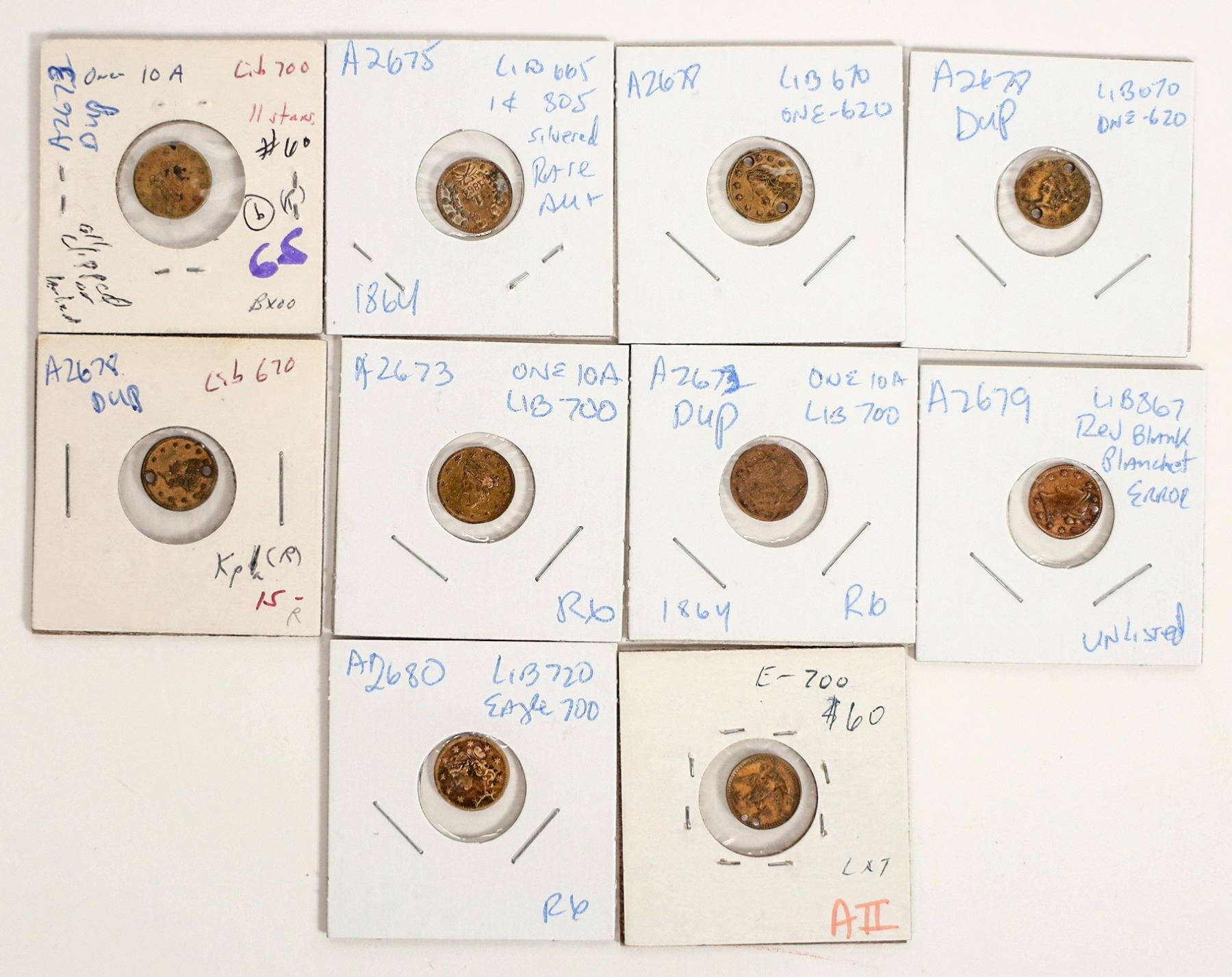 Ten small and scarce brass counters that mimic US gold coins with the head of Liberty.