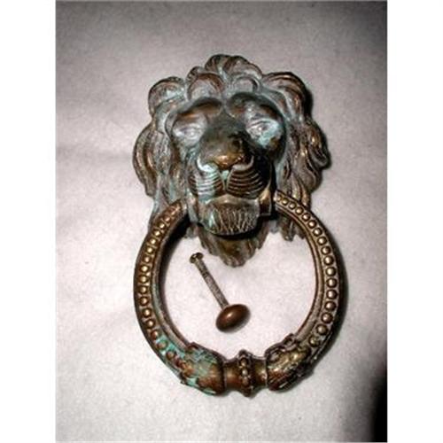 Lions head solid brass door knocker from England includes the brass stop for mounting to prevent door gouges. Aged brass which has not been polished but would shine if desired has bits of verdigris as seen. Heavy ring knocker is embellished with beading. 2 large brass screws in back for attachment. Excellent condition. Measures 9.5H X 6L X 3.5D.