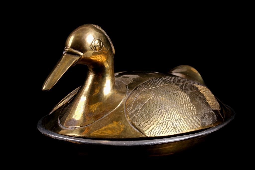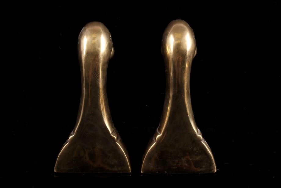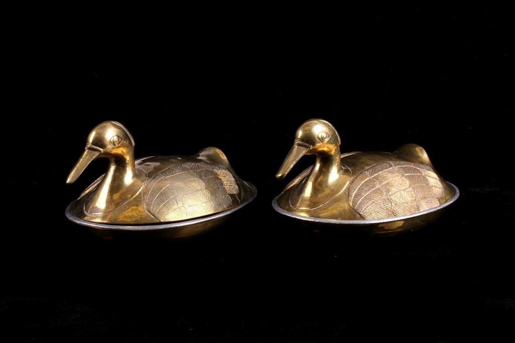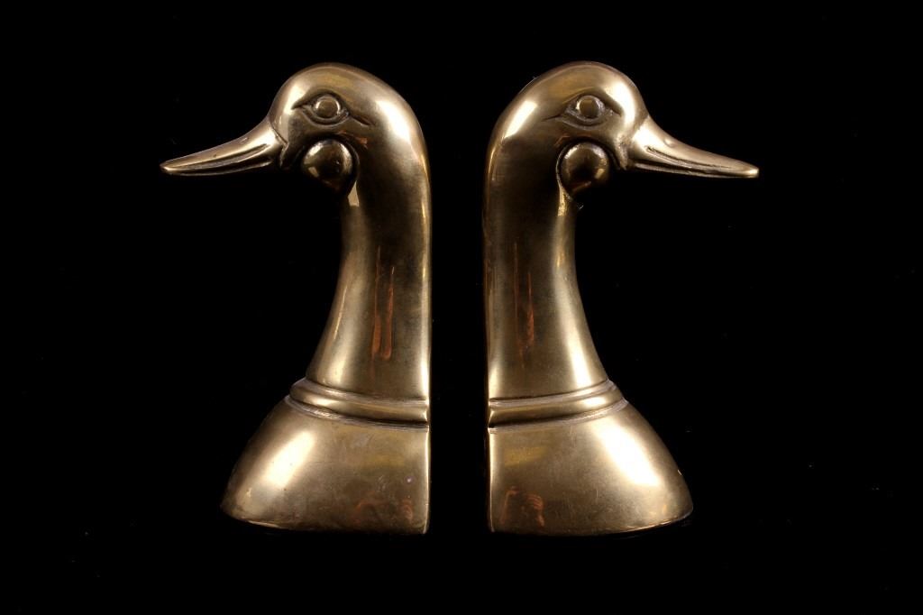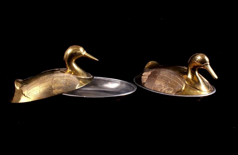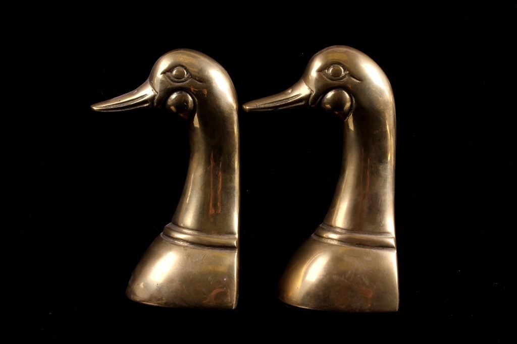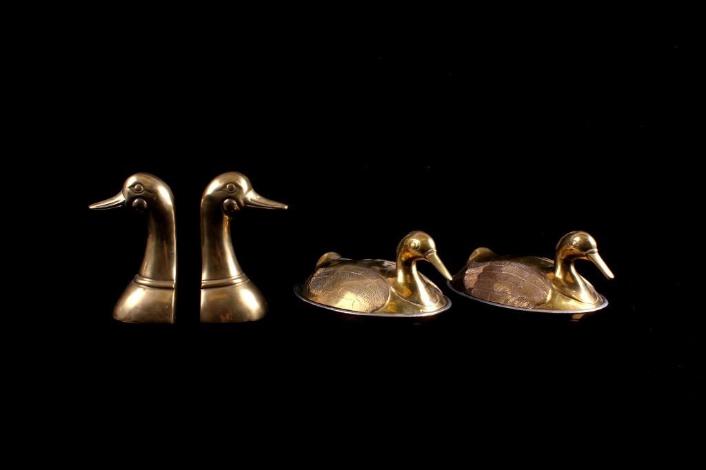 For your consideration is this brass duck serving containers and waterfowl bookends. There are two serving containers and two bookends in this waterfowl collection. These are highly collectable pieces of waterfowl decoration. The serving containers show a horizontal seam and open from the top. The book ends show the ducks facing outward. The condition of the pieces in this collection is good, with no obvious signs of damage. The measurements of these waterfowl duck serving containers are 4 1/2" x 7 3/4" x 5 1/4" and the bookends measure 6 1/4" x 3" x 3 3/4".