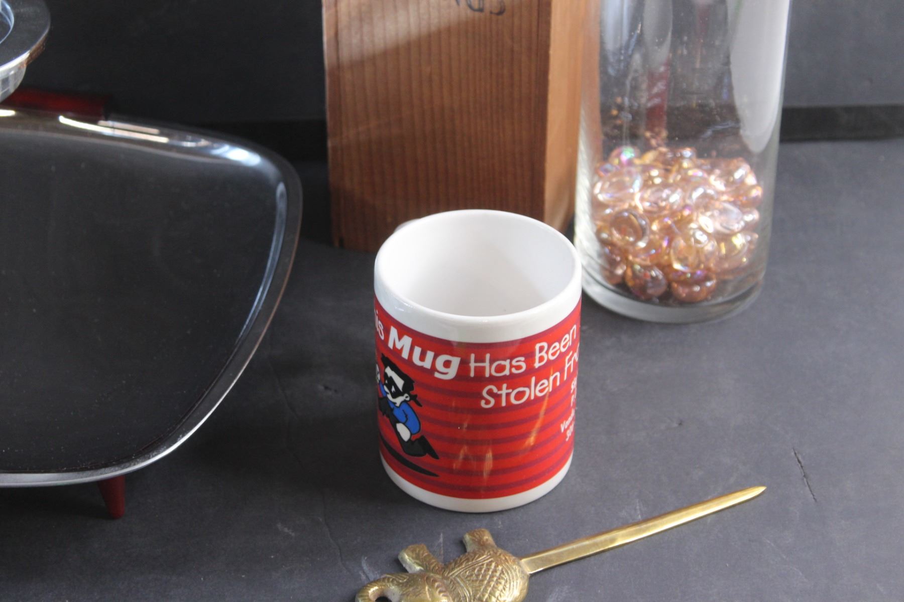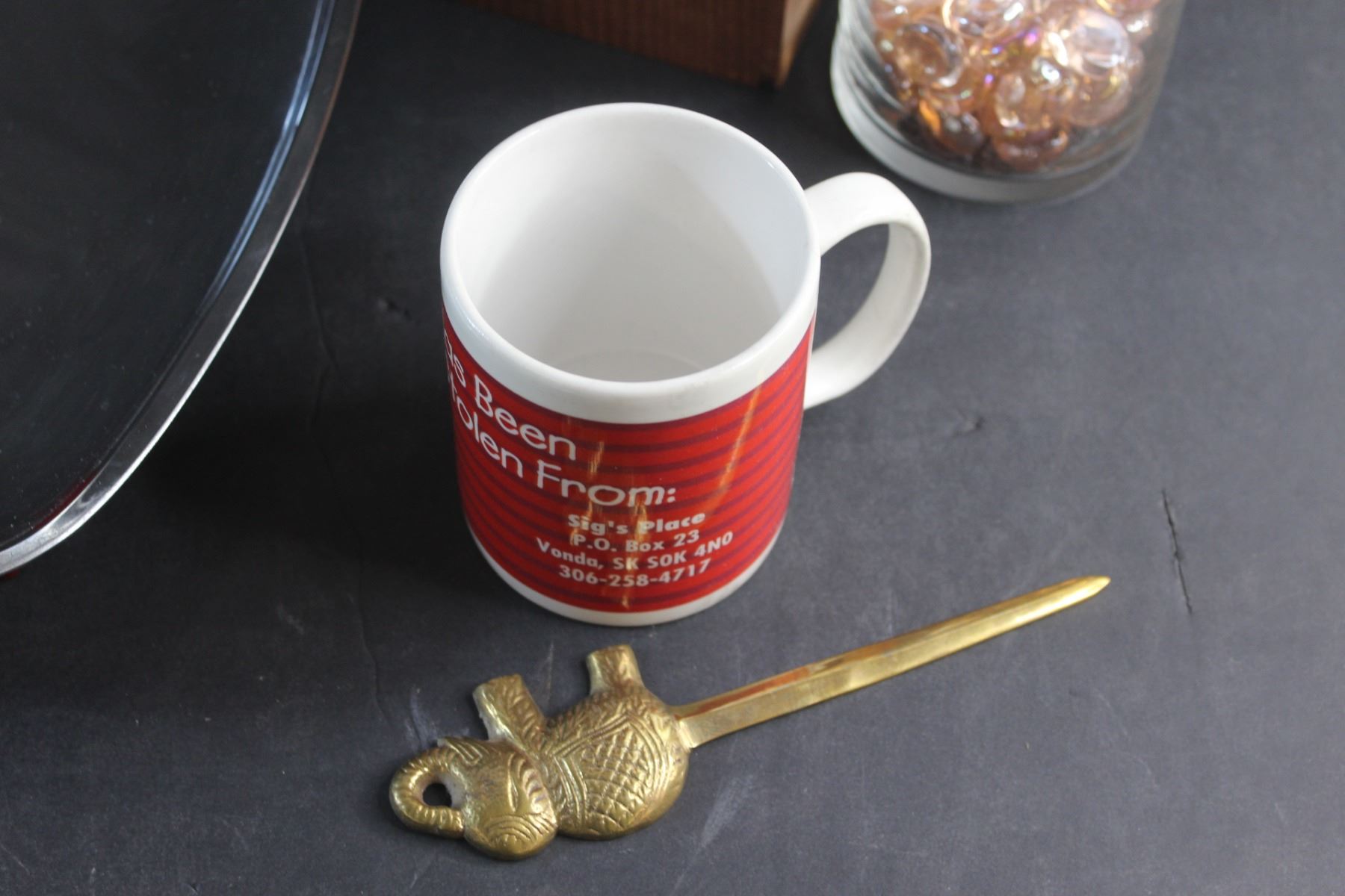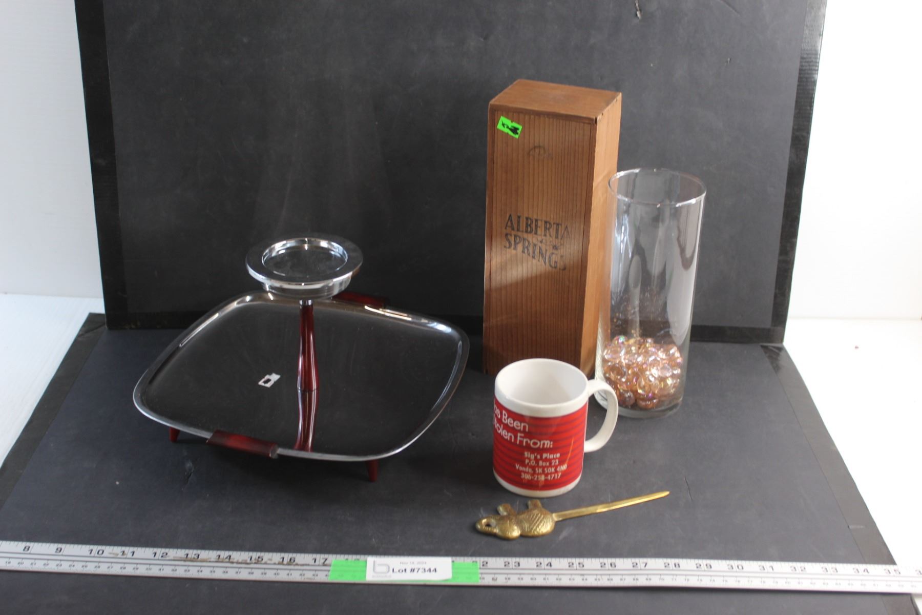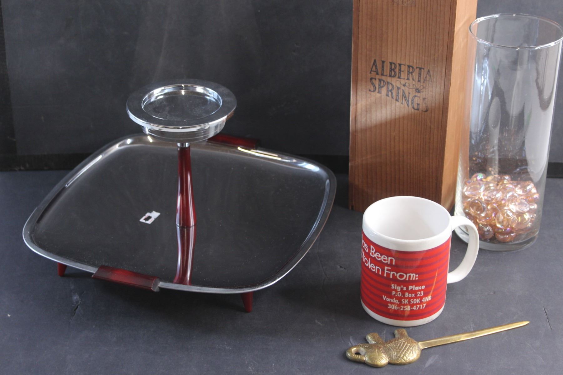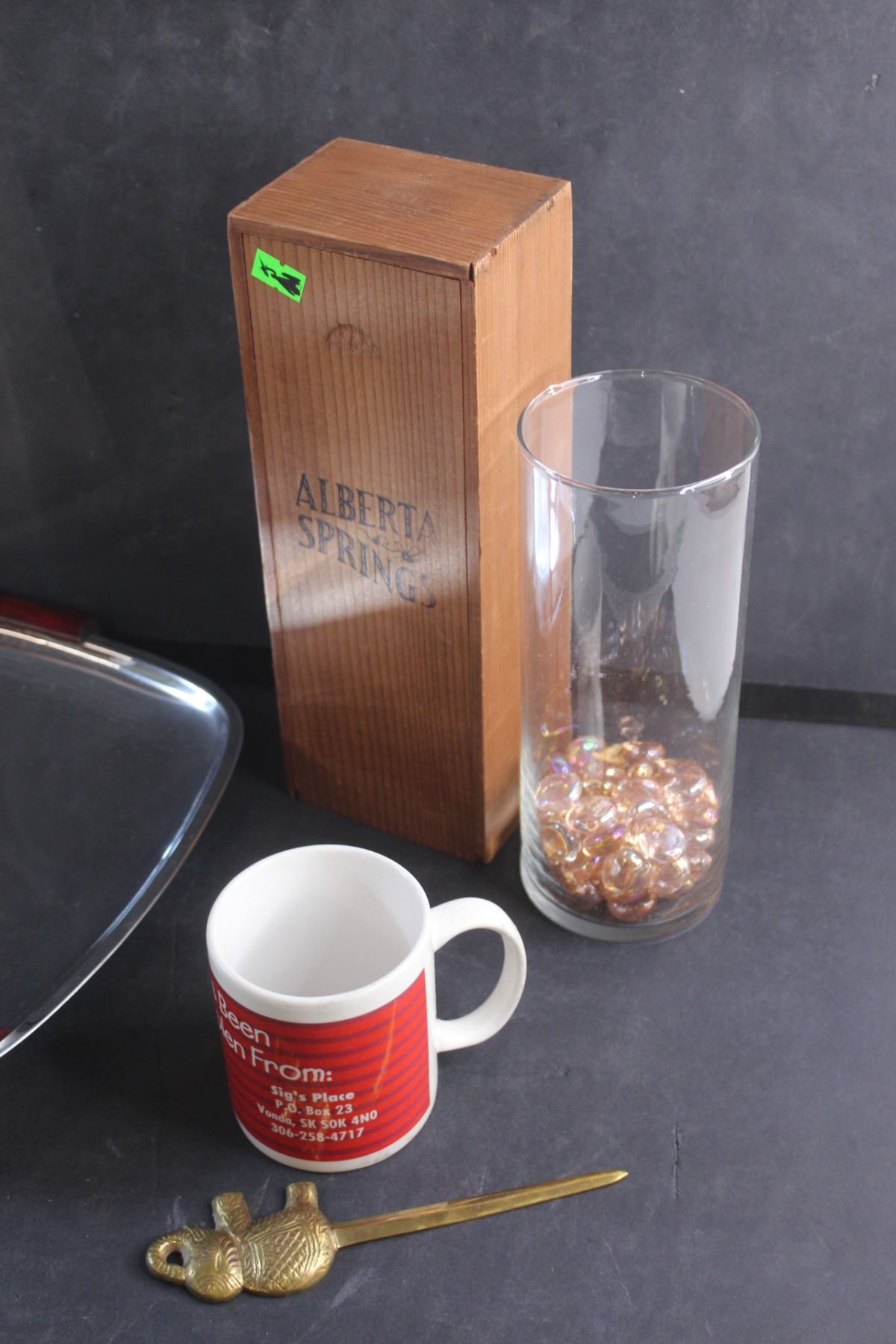 Brass Elephant Envelope Opener, Alberta Spring Bottle Box, Vase, Ceramic Mug and Serving Tray