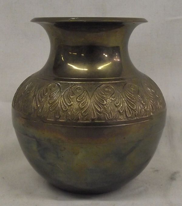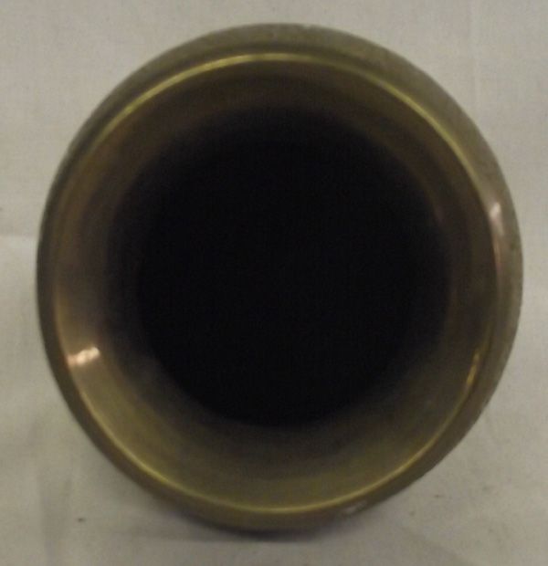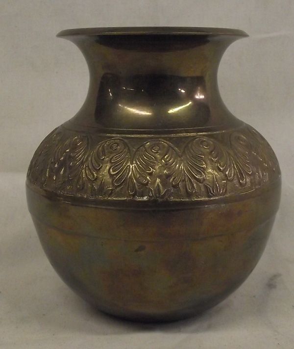 From the Proctor Collection. Brass Embossed Vase, measuring 5'' high x 5'' diameter.