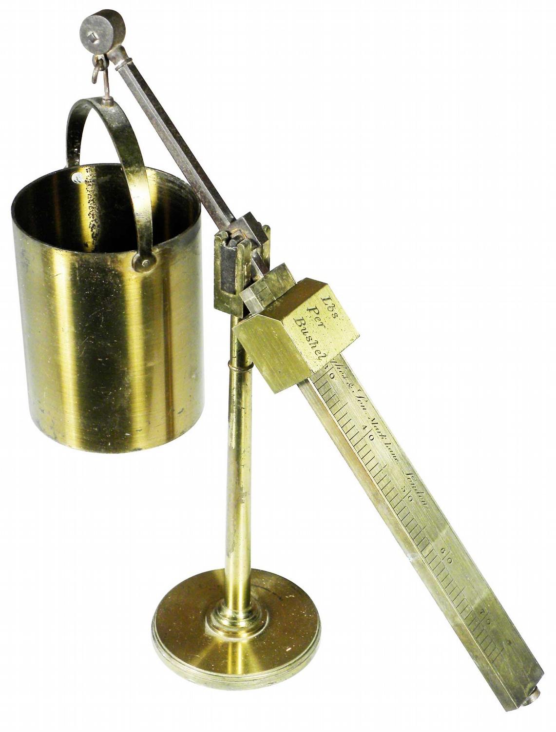 Brass European Scale, pounds per bushel. Excellent condition. 8 1/2 X 9 1/2 X 2 1/2 inches.