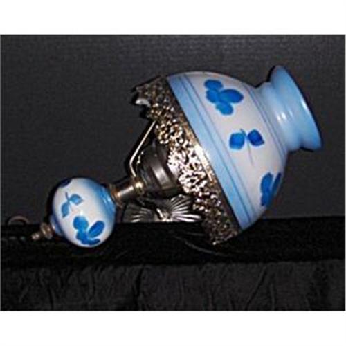<tr><td>Title:Brass Filagree Hanging Lamp w/White, Blue HP</td></tr>