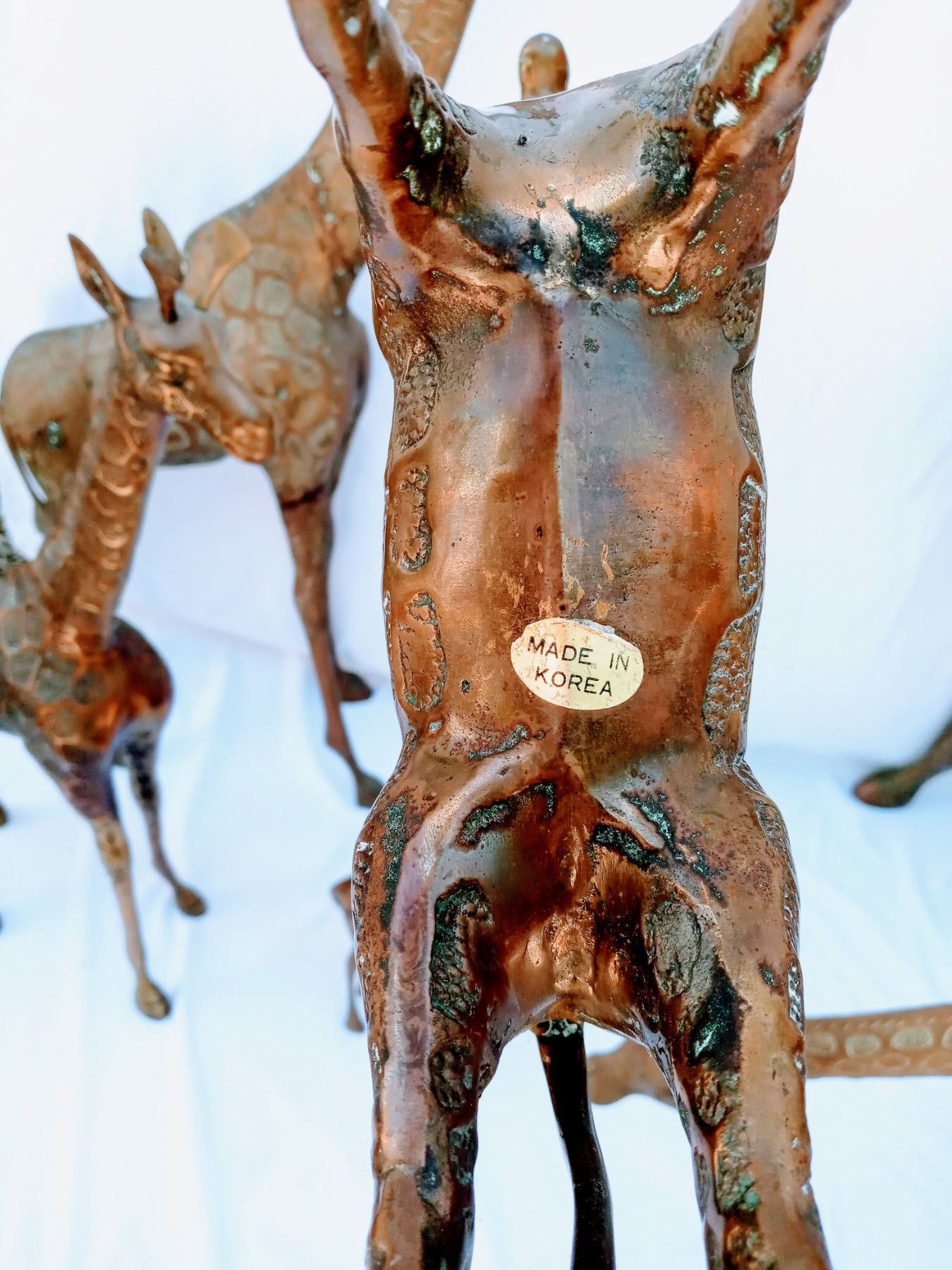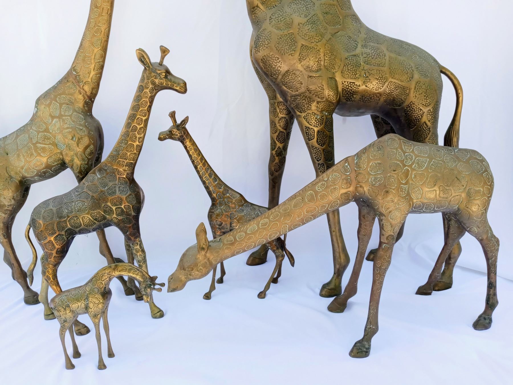 6 Contemporary brass or mixed alloy floor figures that are all standing. 5 are facing upward possibly eating the highest leaves and 1 is grazing on the grass as he is looking downward. These unique figures range in size with the smallest being able to fit in your hand and the largest is human sized. It is rare to see this many giraffes assembled in a group, they normally only have 2 or 3 together. (48 1/2" H x 24" L, 33 1/2" H x 18" L, 17 1/2" H x 24 1/2" L, 23" H x 13 1/2" L and 17" H x 12" L.