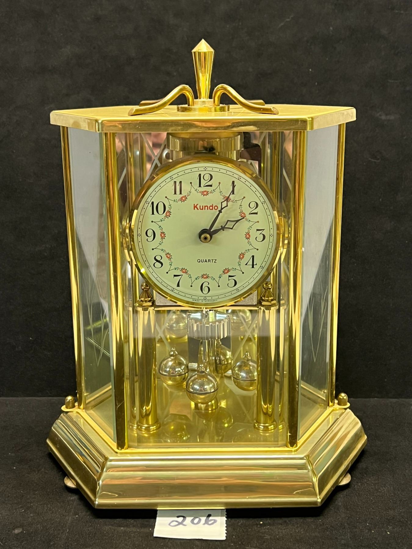 Brass & Glass Kundo Quartz Clock NOT tested (about 10"T 8"W & 5.5"D)