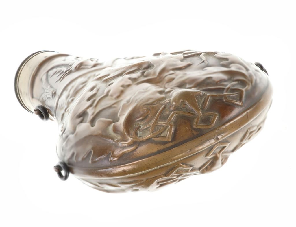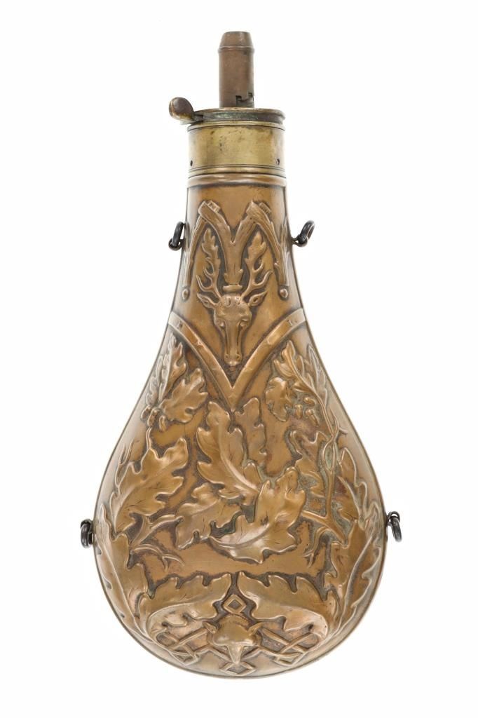 The condition of this is powder flask is good with some denting to the repousse decoration and patina due to age but otherwise shows good overall condition. The measurements of this powder flask is 9 5/8" x 4 1/2" x 2". The collective weight of this powder flask is 10oz.